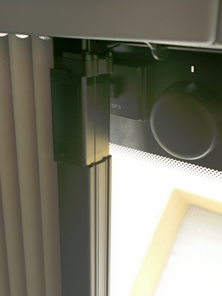 Kamera ve výhledu v sebemenším nepřekáží. Ani zvenku není za sklem příliš patrná. Pokud chci použít rolety (Remis, vnitřní) , musím kamery odcvaknout. To jde velmi snadno, stejně jako její nasazení zpět.