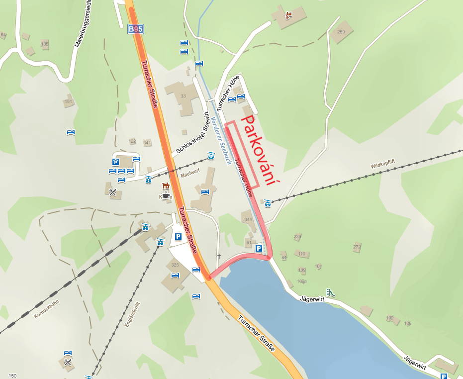 Obytky v areálu parkují na docela pěkném místě. Blízko vleku i lanovky, poblíž jsou i obchody (ski servis apod., obchod s potravinami jsem zde neviděl) a vlastně i centrum celého areálu (což jsou většinou jen hotely, restaurace a parkoviště). Na parkoviště se dostanete z hlavní silnice, kolem jezera a dozadu za hotely. Příjezd není nijak zvlášť upraven, je třeba počítat s tím, že hlavní cesta je odhrnutá na asfalt, ale příjezdová cesta je pod sněhem. S celoročními pneumatikami nebyl příjezd problém.