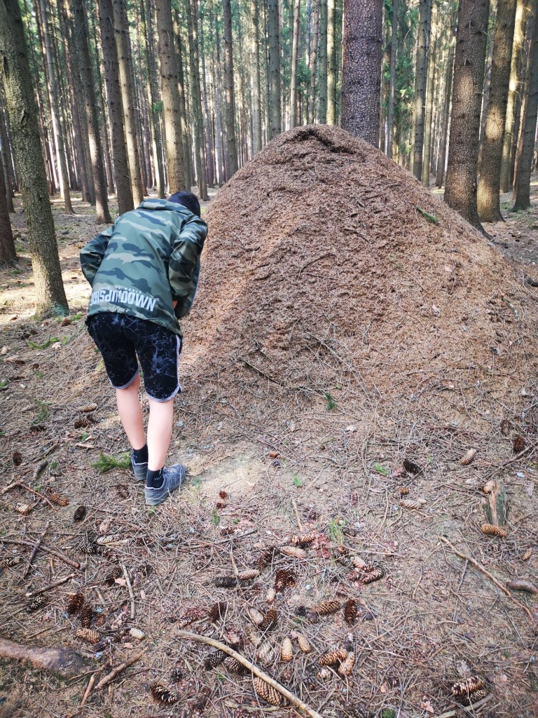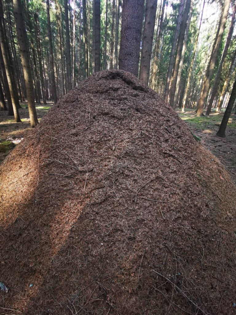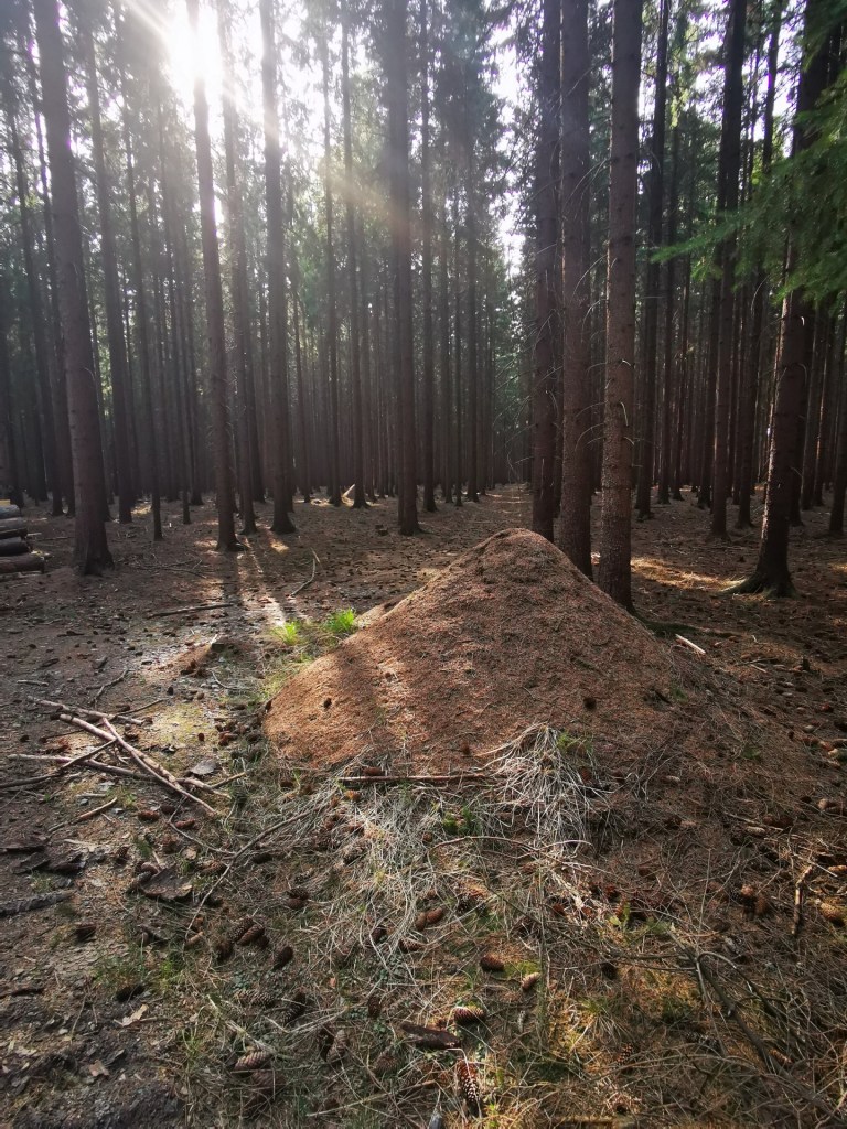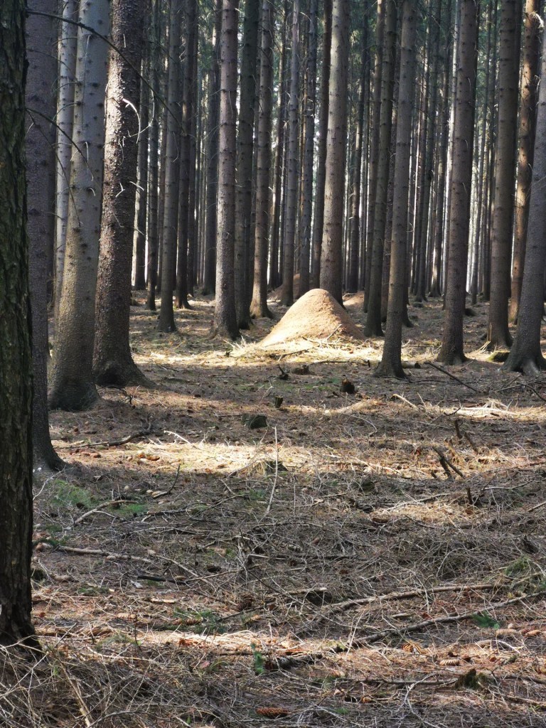 Na polovině cesty mezi Radešínem a Skleném nad Oslavou lze odbočit z cyklostezky 5229 a rázem si všimnete něčeho neobvyklého – všude kolem cesty a hluboko do lesa se nacházejí mraveniště. Kupky o výšce do půl metru ani nemá cenu počítat, ale z lesa vyčnívají hromady o výšce přes metr a půl. Jedná se o jednu z mála oblastí ČR, kde se v takové míře vyskytují mraveniště. Prý jich tu žije odhadem kolem 60 milionů. Napadla mne zábavná představa, že si tady nějaký tramp v noci, unaven po celém dni, ustele – měkké jehličí asi začne za chvíli pěkně bodat.