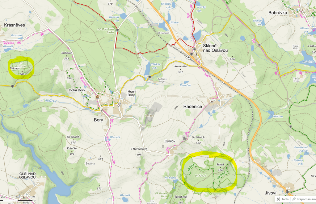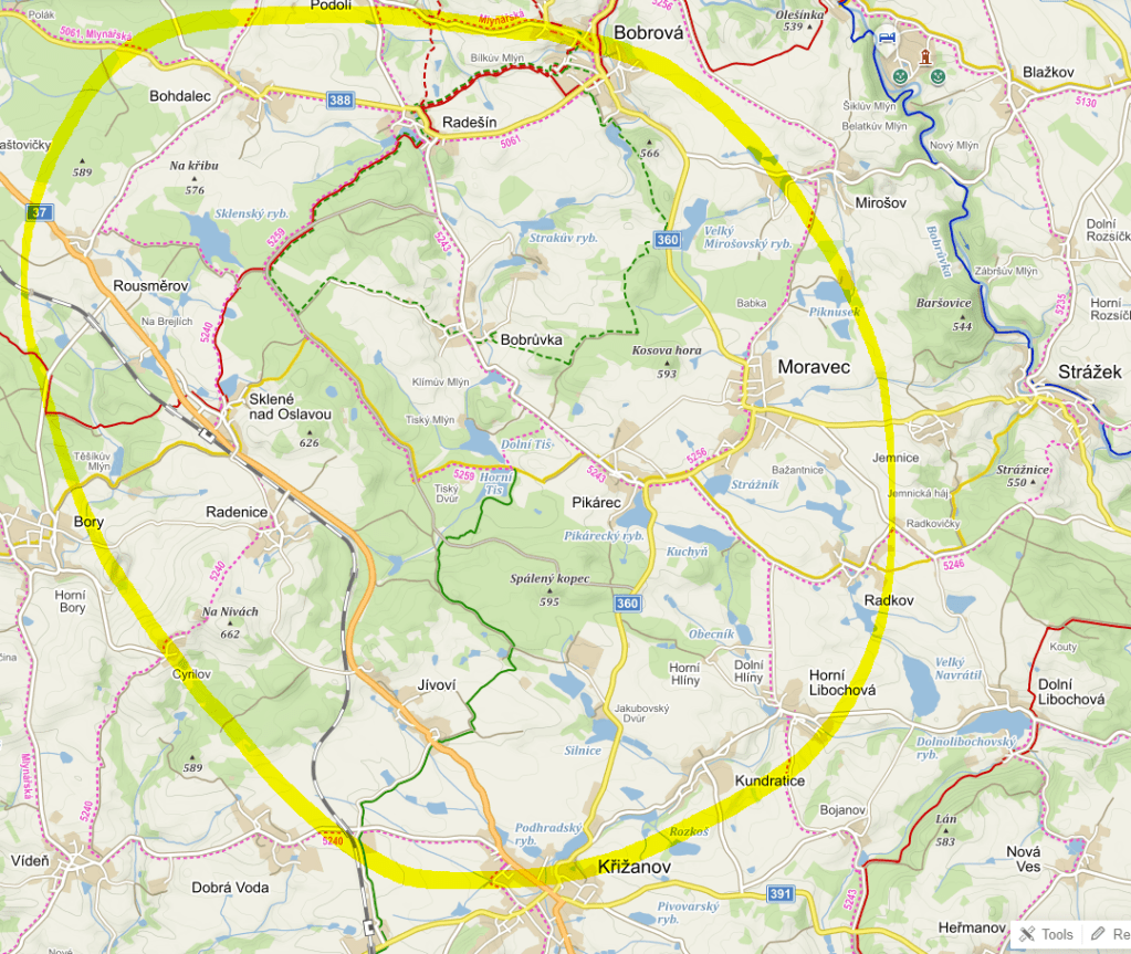 Poznámka: silnice mezi Bobrovou a Radešínem se opravuje, v Bobrové je zákaz vjezdu. Ale lze to projet či opravovaný úsek v Bobrové objet bočními ulicemi.