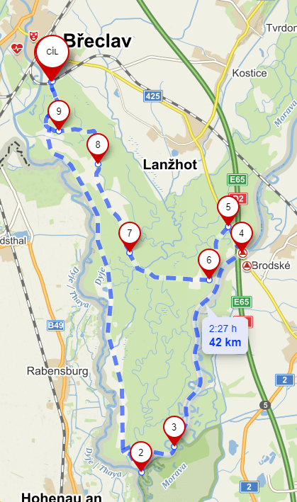 Od Břeclavi na jih leží cca 16km dlouhý a 3 km široký pruh země protkaný převážně asfaltovými cestami, s naprostým vyloučením aut a s možností dostat se na jedno z naších trojmezí – hraniční bod mezi ČR, Slovenskem a Rakouskem. Navíc zde lze nalézt dostatek míst na přenocování „na divoko“.