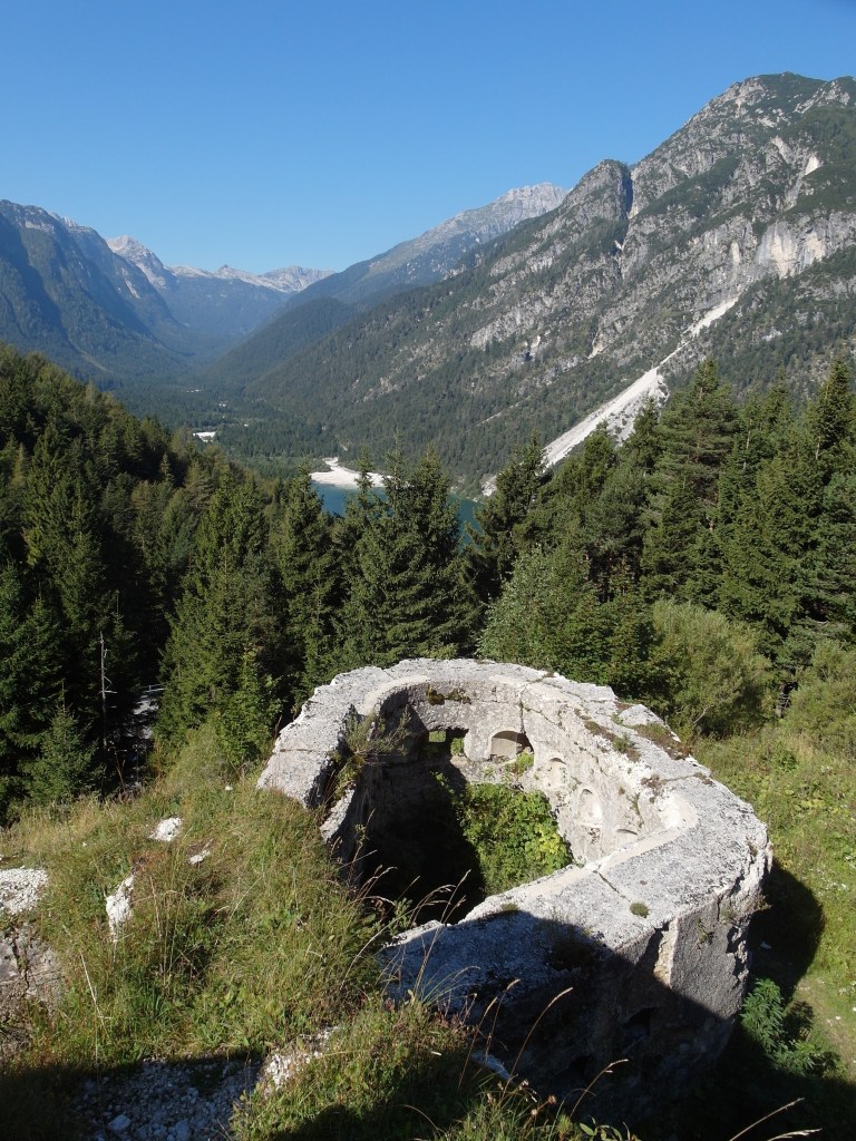 Pokud se rozhodnete pokračovat dále do Slovinska, stoupá od jezera cesta nahoru do sedla. Zde lze ještě navštívit trosky staré pevnosti Batteria di Sella Predil, je z ní pěkný výhled. I tady je malé parkoviště, stát přes noc jsem nezkoušel.