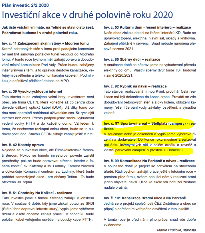 Dle zpravodaje obce Tetín to vypadá, že budují stání pro obytné vozy, respektive stellplatz – že by jeden z mále obecních stellplatzů v ČR? Každopádně by to bylo stání ve velmi zajímavé lokalitě, kam vás může nalákat i tato reportáž televize Seznam
