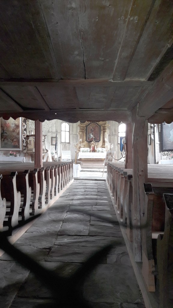 S historií místa pak seznamují panely vevnitř – kostel se otevírá ráno kolem osmé. V sedmdesátých letech toto několik set let staré místo zbourala firma z Brna : -( , obnoveno pak bylo v devadesátých letech.