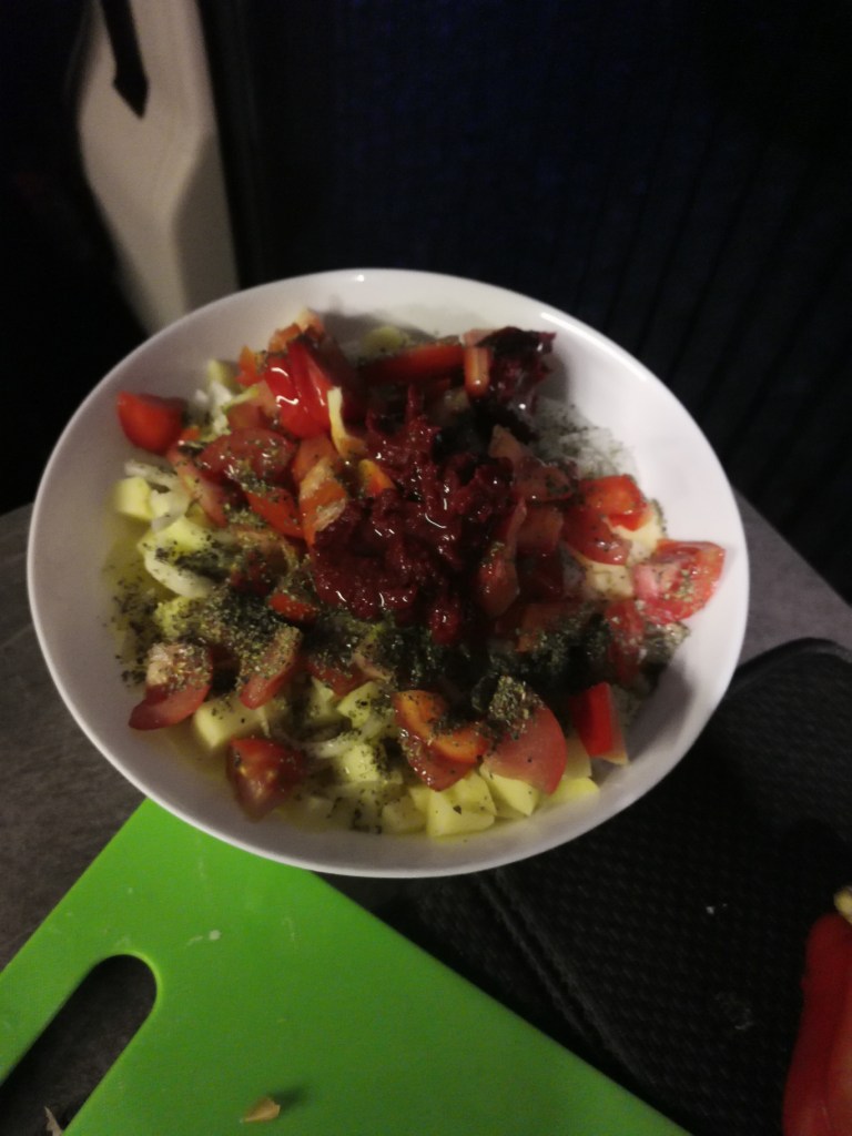 Brambory oloupeme, umyjeme a rozkrájíme na kostičky do další misky. Stačí 4 ks brambor na obrázku je pět a bylo to moc -takže s rozvahou a 4 ks větších brambor určitě stačí. Po rozkrájení propláchneme vodou.