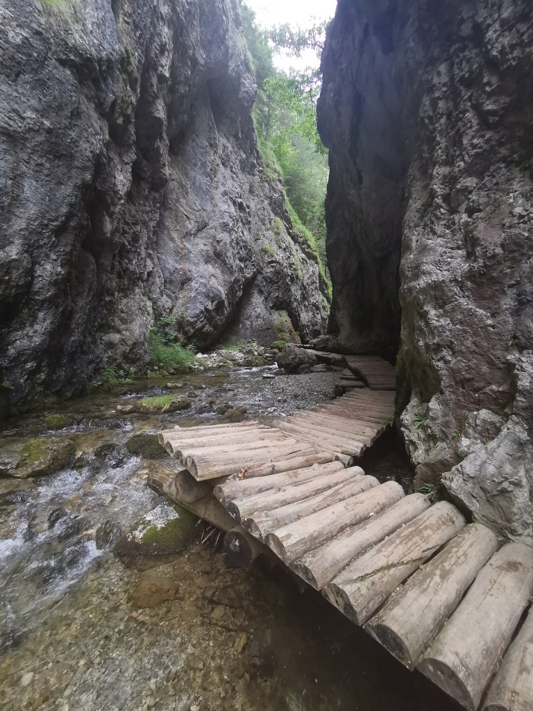 Ta je i důvodem, proč se od mlýnů cesta prudce zvedá. Říčka se zařezává do skal a tak stezka musí nahoru. Dokonce zde kdysi vedla regulérní silnice a jezdila zde auta. Což se zdá k neuvěření – cesta je dost strmá a vede dost vysoko, navíc se nezdá ani kdovíjak široká. Na tenhle fakt ale upozorňují i cedulky kolem cesty. Dneska jsou zde jen turisté – dopravu převzala silnice 584, po které jsme ostatně od Liptovské Mary i přijeli.