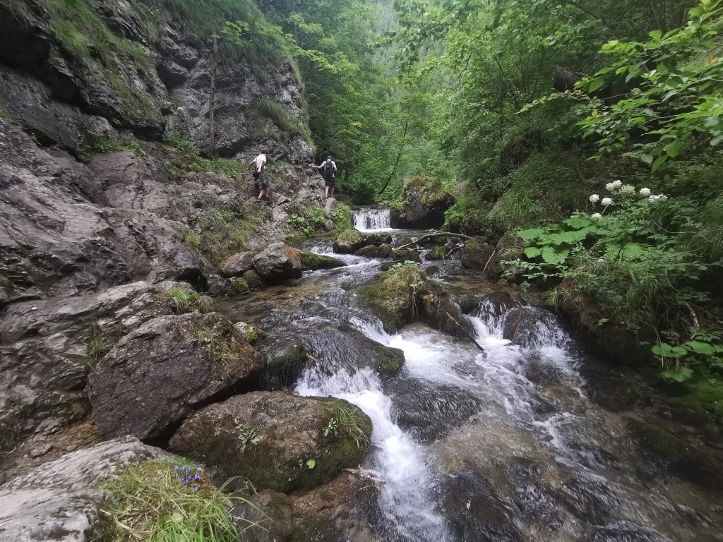 Byl jsem překvapen, jak málo jsme v Prosiecké dolině potkali lidí. Přitom je to mnohem zajímavější oblast než Kvačianská dolina – místo cesty lesem s málo výhledy nabízí rozmanité scenérie, od soutěsky, přes nutnost přehopkání nad potokem, po cestu kamenitým korytem až po žebříky na konci. Ale nic těžkéhoů – tohle zvládne i průměrný turista.