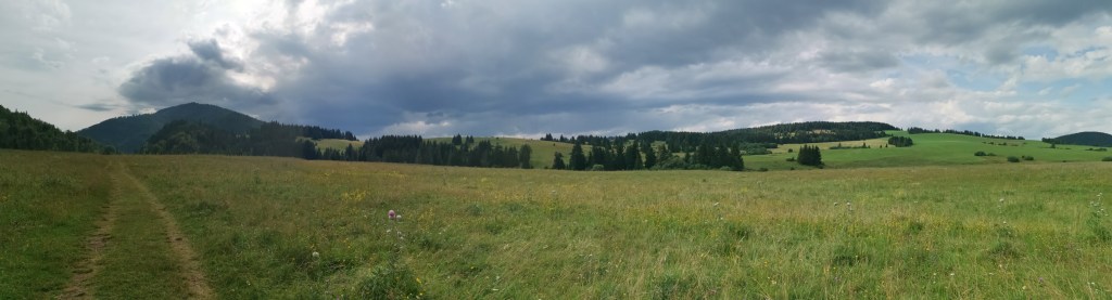 Kotlina je pak ukončena žebříky a jsme opět na Oravě. Cesta zpět k autu, zaparkovanému ve Velke Borové vede po louce s výhledy na celé údolí obce a Roháče.