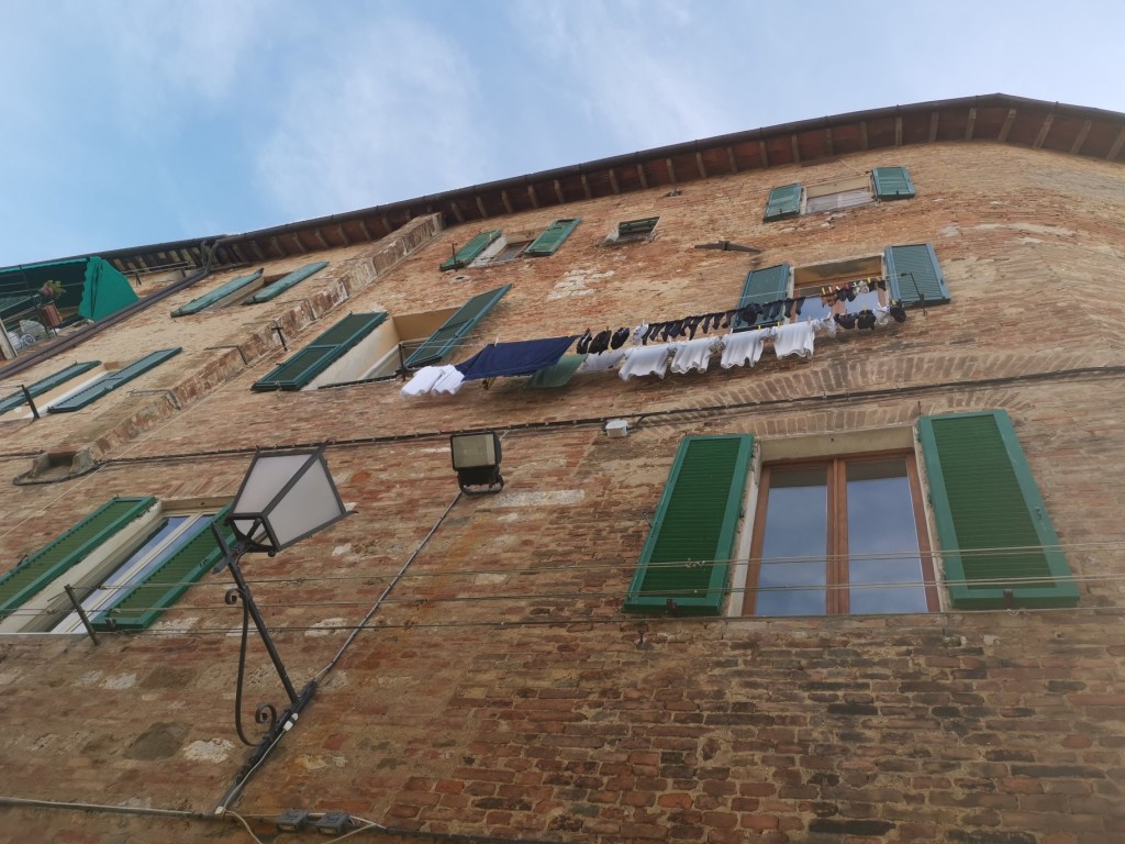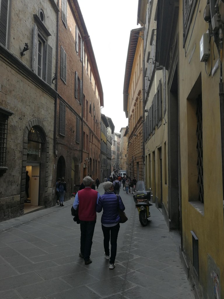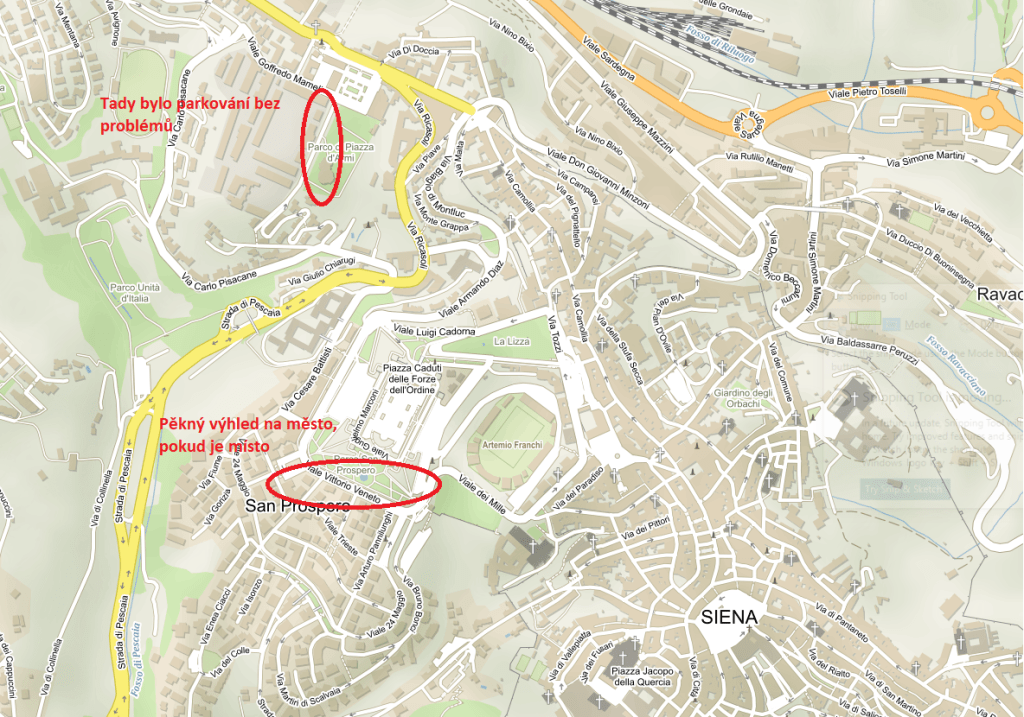 Odtud je to již skok do Sieny. Problém byl nalézt místo na parkování, bylo skutečně plno. Jindy lze nalézt pěkné místo s výhledem na Viale Vittorio Veneto, my ale takové štěstí nemělo a všude bylo plno. Nakonec jsme ale nalezli volné místo, vlastně hodně volných míst, na Viale Giovanni Amendola, parkováni je samozřejmě placené (€1.50 hodina), ale zase hned u kasáren a neměl jsem pocit, že bychom zde někomu překáželi. Navíc historické centrum začíná téměř „za rohem“, u brána Porta Camollia.