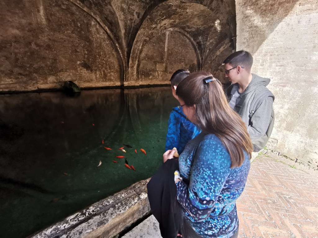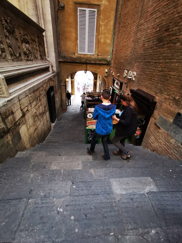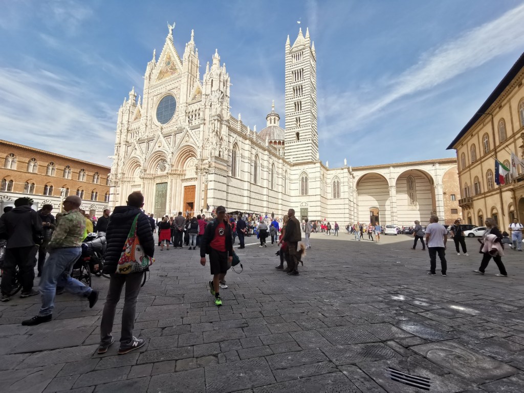 Z náměstí jsme zamířili k bazilice-katedrále Duomo di Siena, která je druhou nepřehlédnutelnou dominantou města. I tady ale lze čekat davy turistů. O mnoho klidnější a komornější zážitek pak ale nabízí cesta od ní pak dolů k vodnímu rezervoáru Fontebranda a zase zpátky nahoru do města. A pak již zpět k autu.
