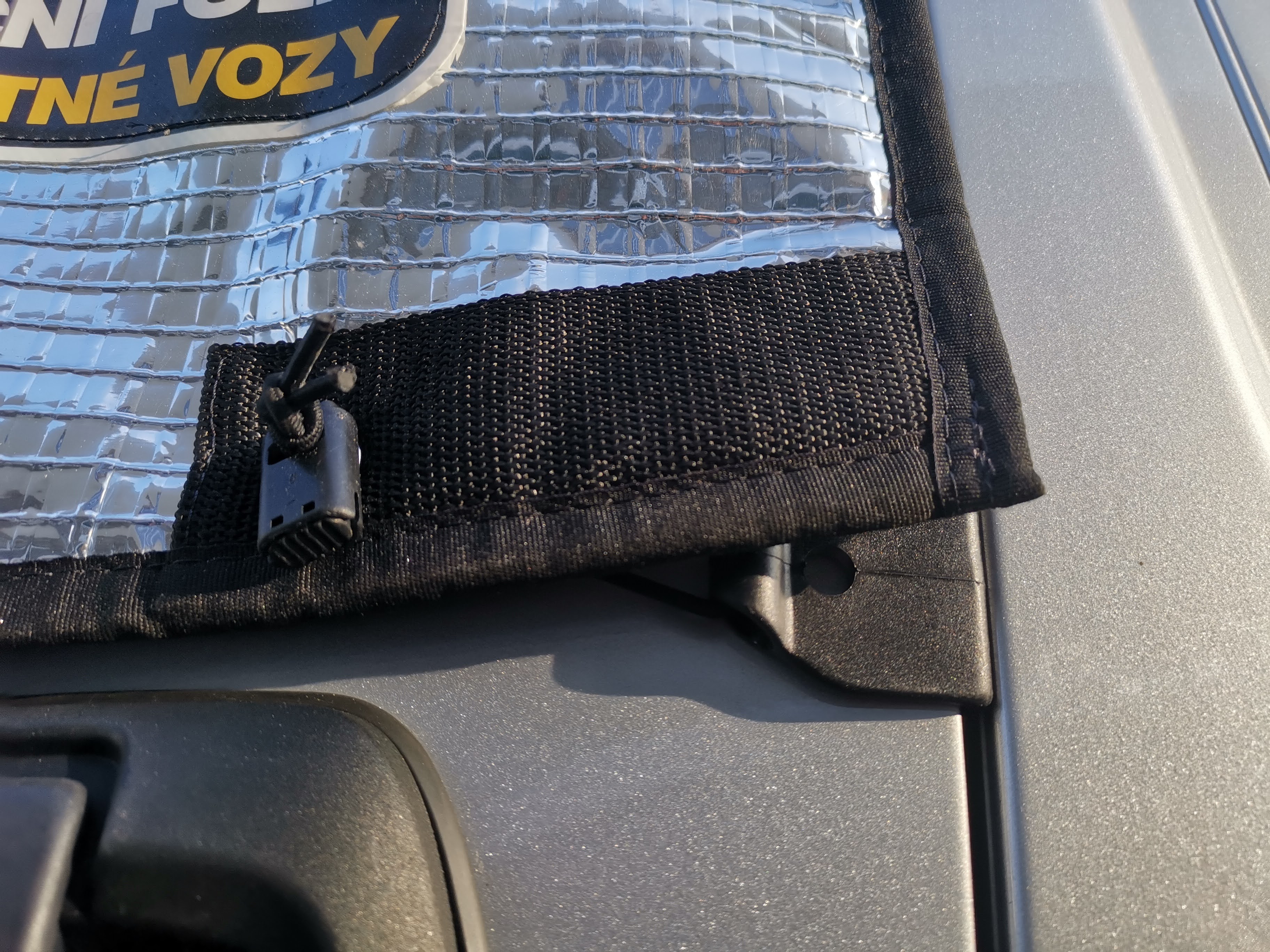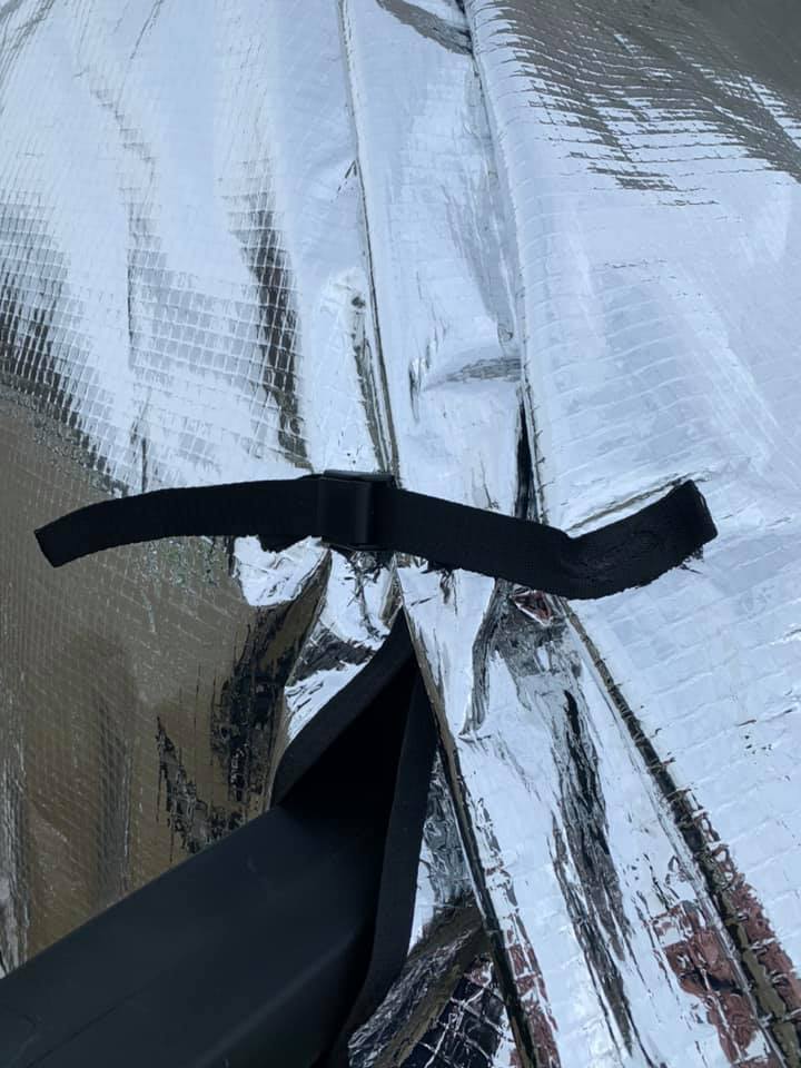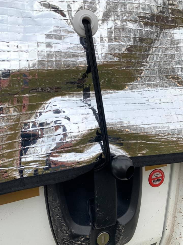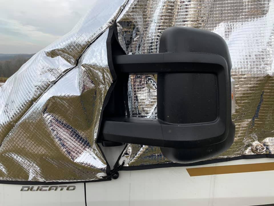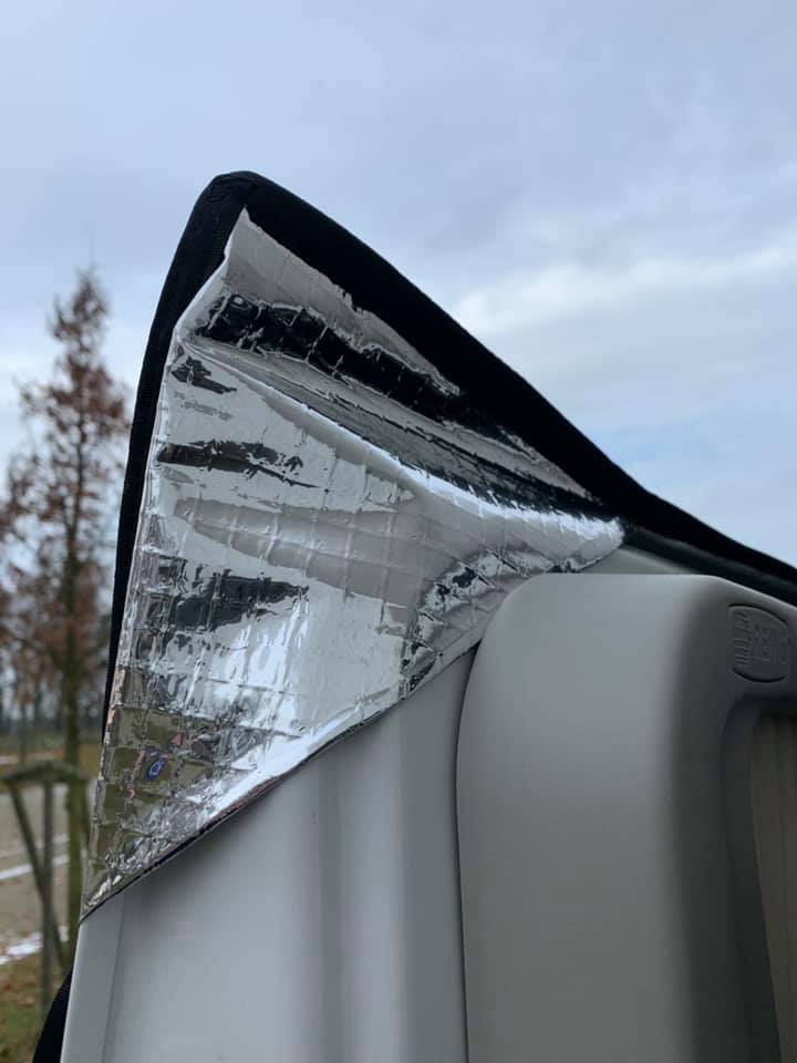 Izolaci oken tvoří pěna tl. 8mm s POE podšívkou, vzduchová komora, zvenku zrcadlová folie. Dveře spolujezdce jde otevřít i bez sundání. Po obvodu dveří jsou našité magnety (obvykle 13 ks), které se pevně přicvaknou na plech karoserie, aby pod izolaci netáhlo, sada gum a plastových háčku pro fixaci, včetně uchycení na hrany dveří dole.