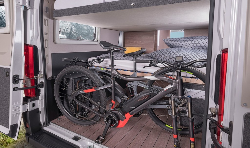 Pokud jsou ale postele napříč (většinou u vozů délky do 6 metrů), tak výbava pak vyčnívá až do uličky a dle řešení dispozice vozu omezuje nejen pohyb v uličce, ale zabraňuje i otevírání skříněk či lednice. Ideální je pak možnost umístit lyže napříč, ale tomu musí být uzpůsobeno řešení zavazadlového prostoru. Hodně vozů má boční část využitou až na doraz, tj, k zadním dveřím a prostor je tak úzký. Vhodné je, pokud boční skříňky, sloužící většinou k uložení plynových lahví a nádrží na vodu, končí ještě před koncem vozu a vytvářejí tak dostatečný prostor pro uložení zimní sportovní výbavy. Jen pozor, toto řešení často znamená, že bude obtížnější přístup k plynovým lahvím – což nemusí být na překážku, pokud máte naftové topení a plyn máte pouze na vaření. I 5kg lahev vydrží dlouho. Duo nebo mono regulátor s nárazovým senzorem je pak ale nutností – nemusíte plynovou lahev před jízdou zavírat (více ve článku Plyn ve vestavbě: zkušenosti) Popřípadě může být plynová lahev pouze na vaření umístněná v kuchyni, s přístupem přes dvířka v zadní stěně skříňky (objeví se po otevření bočních posuvných dveří).