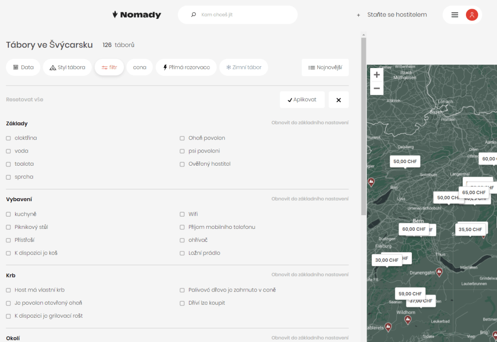 Vybírat místo si lze pomocí mapy a nebo jsou místa tematicky roztříděna. U každého místa je pak vypsáno jeho vybavení i to, pro jaký typ ubytování je vhodné, samozřejmě je uvedena i cena za noc.