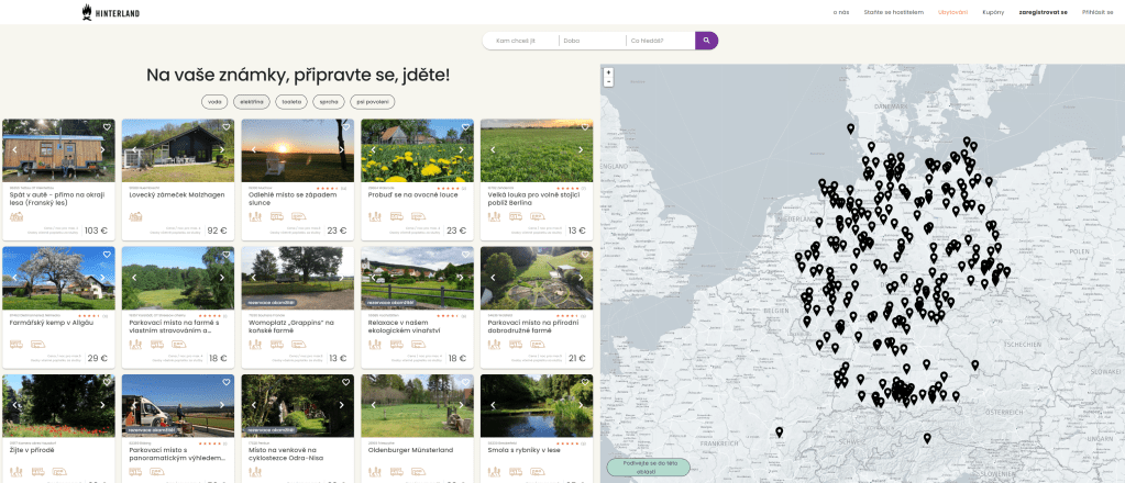 Rozhraní služby Hinterland je jednoduché – základní vyhledání vyžaduje jen zadání termínu a upřesnění, zda hledáme místo pro stan, obytný vůz, přívěs a nebo normální ubytování. Další filtr je jednoduchý – zvolit si jde některé ze základních očekávaných služeb jako voda, elektřina, WC či možnost přijet se zvířecím společníkem. Cena je závislá na zvoleném místě – v podhůří Alp lze najít místo za astronomických €57, naopak v méně atraktivních lokalitách je cena citelně nižší, třebas jen €18 , u lužických jezer jde pak kempovat jen za €13 a nejlevnější nabídky začínají na €10. U každého místa jsou jak fotky, tak i možnost zobrazit si jeho lokaci na mapě, přehledně je pak uvedeno jeho vybavení. Samozřejmostí je i hodnocení hostů – služba funguje od minulého roku (2020), zprostředkovala již několik tisíc pobytů a tak lze na názory hostů narazit u většiny nabídek.