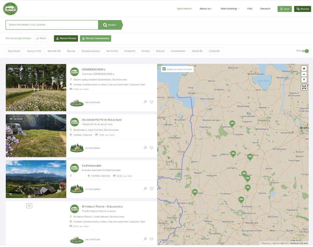 Místa především na venkově, u zemědělských usedlostí. Rozsáhlá nabídka filtrování i informací o vybraném místě, nabídky v rozmezí zhruba €12 do €40. Samozřejmostí jsou podrobné fotky místa i další data – s jakými domácími či chovnými zvířaty je možné se setkat, pro která vozidla či typ přenocování je místo vhodné, co lze vidět v okolí a mnoho dalšího. Sympatická je poměrně rozumná provize ve výši 12.5%.