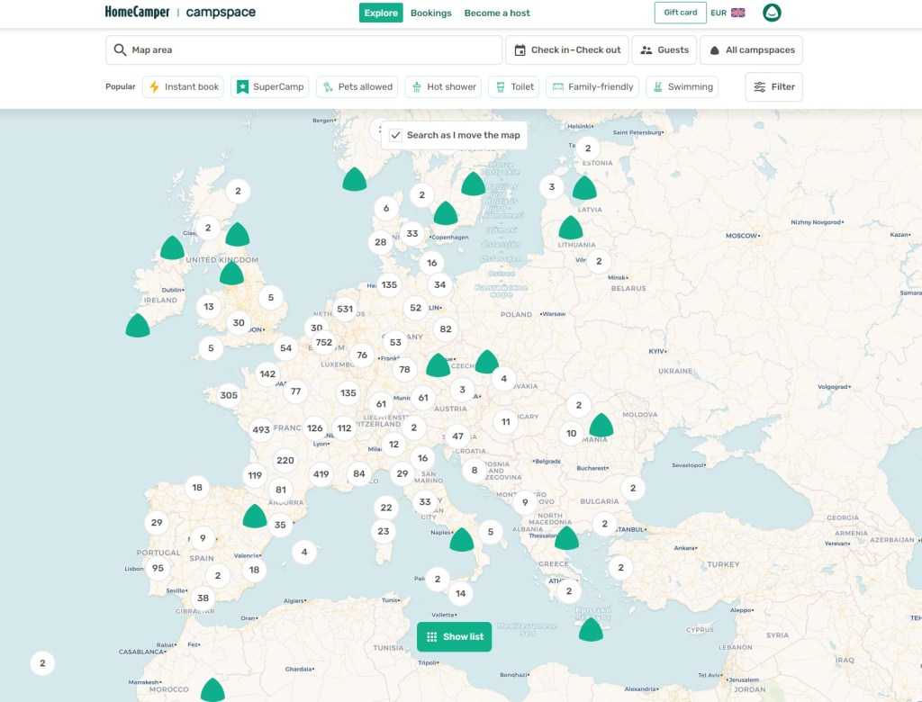 Možnosti vyhledávání se příliš neliší od podobných služeb, základní filtr umožňuje vybrat místo, dobu a zařízení (stan, karavan, vestavba, obytný vůz). V podrobném filtru je pak možnost nastavit i typ aktivit, které lze v okolí provozovat či vybavení vlastního místa a omezit cenu místa. Ta se nejčastěji pohybuje někde v rozmezí €15 – €30 – záleží na lokalitě i vybavení místa.
