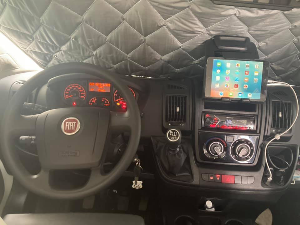 Jako držák telefonu nemusí sloužit jen Brodit, lze použít například i QuadLock. Ten pak ve voze vypadá takto – jedná se o fotky z kabiny MB Sprinter, ale stejně dobře jej lze použít i ve voze Ducato. Výhodou je možnost použít stejný systém i mimo vůz, tedy například na kole, motorce a podobně.