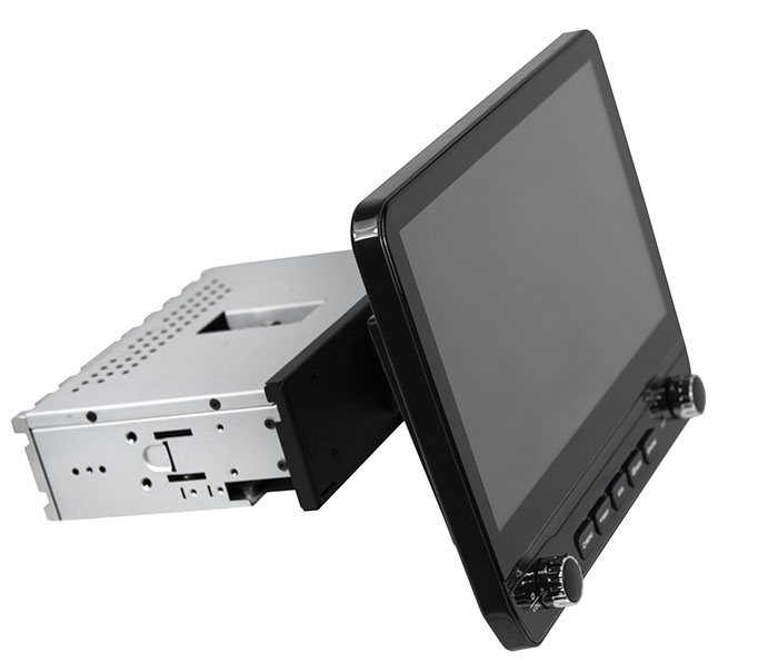 Nedostatek malé zobrazovací plochy mohou do jisté míry řešit rádia s vysouvacím displejem. Vypadají však hůře – více vyčnívají do prostoru mimo palubní desku, a mohou být i citelně drahé. Asi nejlevnějším provedením je model Sencor SCT 9411BMR s cenou kolem 3.300 Kč, dražším zástupcem je pak model Macrom M-AN6560 s operačním systémem Android 9.0 či autorádia značky Pioneer v ceně od cca 14.000 Kč nebo přístroje značky Alpine – tyto dražší modely mívají již i DAB modul pro příjem digitálního rozhlasu. Samozřejmostí jsou i video vstupy – jeden až dva dle modelu.