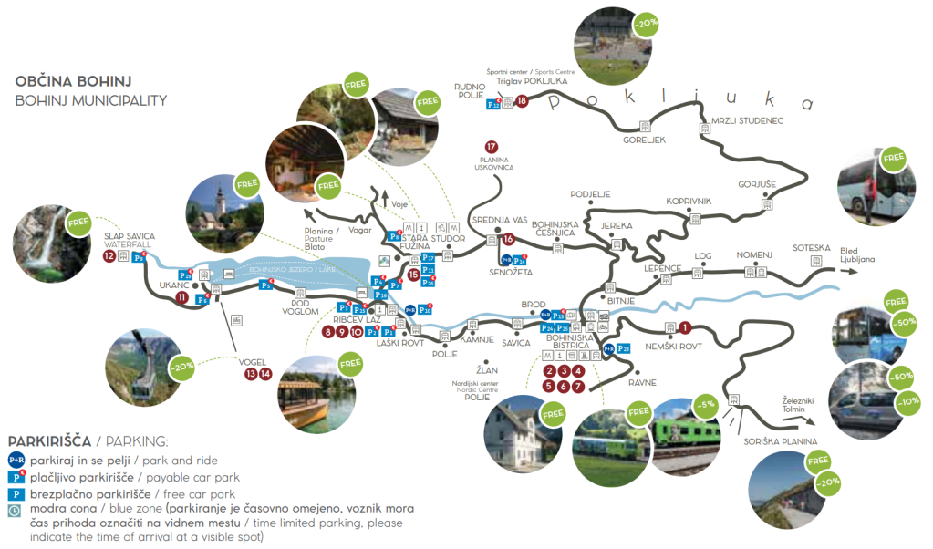 Parkování obytných vozů je ale možné jen na vybraných parkovištích a to jen přes den. Případný pobyt přes noc v obytném voze (placené) lze jen na parkovišti Senožeta anebo u nádraží v Bohinjska Bistrica . Mapka parkovišť je dostupná zde.