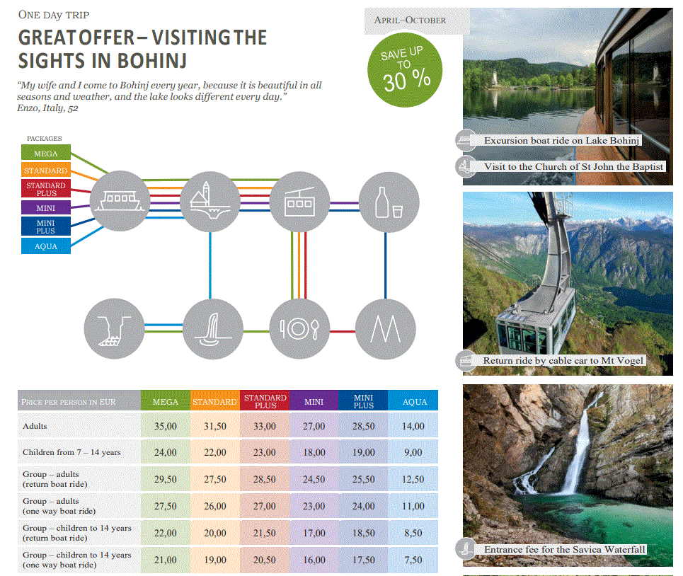 Další možností jak ušetřit, je koupit si jeden z tzv. Bohinj balíčků. Těch je celkem šest verzí a asi nejvíce se vyplatí ten nejdražší s názvem Mega. Balíček pokryje:
