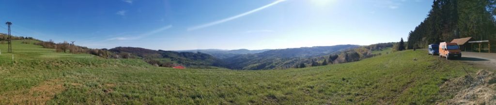 Pro spaní jsem měl vytipována tři místa, buď velké parkoviště u lyžařského areálu Mikulčin vrch (to jsem si ale nechával jako poslední volbu) , parkoviště za horskou chatou Vyškovec – z něhož je impozantní výhled do okolí a nebo parkoviště na Vyškoveckých Bošačkách. U chaty už stály dvě obytky, takže jsme skončili nad Vyškovcem. Zprvu samy, ale pak se objevili další dvě obytná auta. Není divu, výhled do kraje je zde kouzelný.