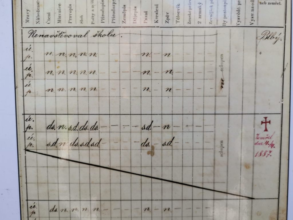 My se ale vydali strmě dolů k přehradě. Klesání je strmé a stoupání jakbysmet. A dole na parkovišti zase další obytka :-). Z naučné stezky Okolo Hrozenka se stala na chvíli naučná stezka Moravské Kopanice – zdejší informační cedule jsou navíc vtipné, na jedné se lze podívat i na školní záznamy z let minulých. Tehdejší učitelé hodnotili krátce a asi i výstižně, v dnešní době by jim takové stručné hodnocení asi jen tak neprošlo.