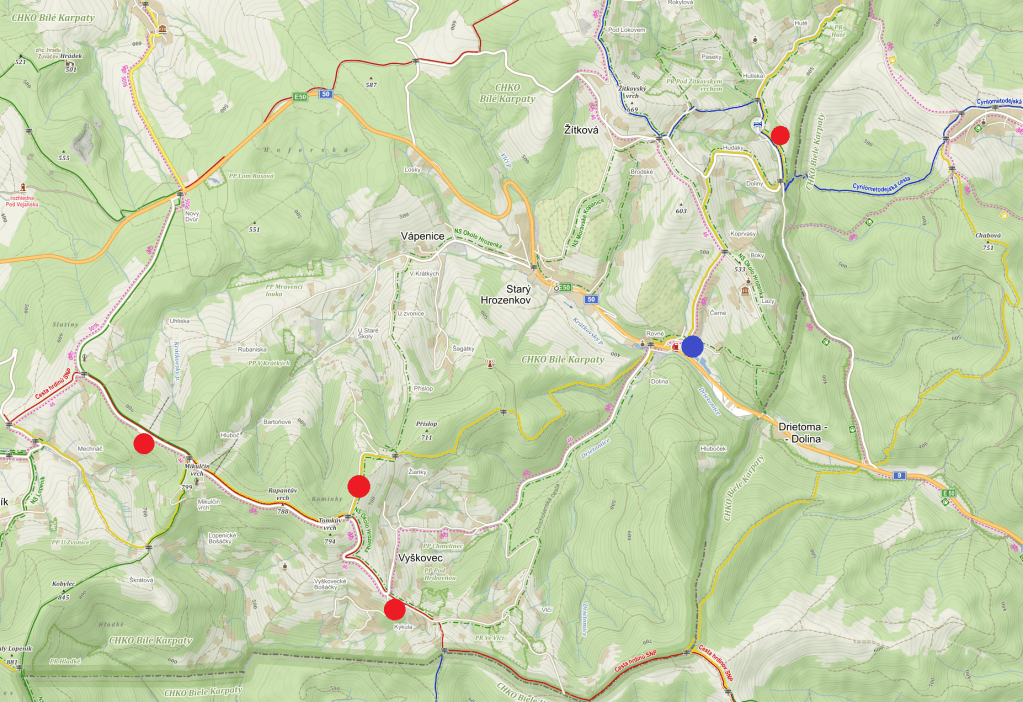 Pro přehled, toto je mapka s vytipovanými místy na stání (červené body) a polohy kempu (modrá) – ale v okolí jsou i další místa, stačí si vzít mapu a hledat. Díky reliéfu pohoří si lze užít jak západu, tak i východu slunce s výhledy jak na hornaté Slovensko, tak do roviny směrem k Uherskému Hradišti.