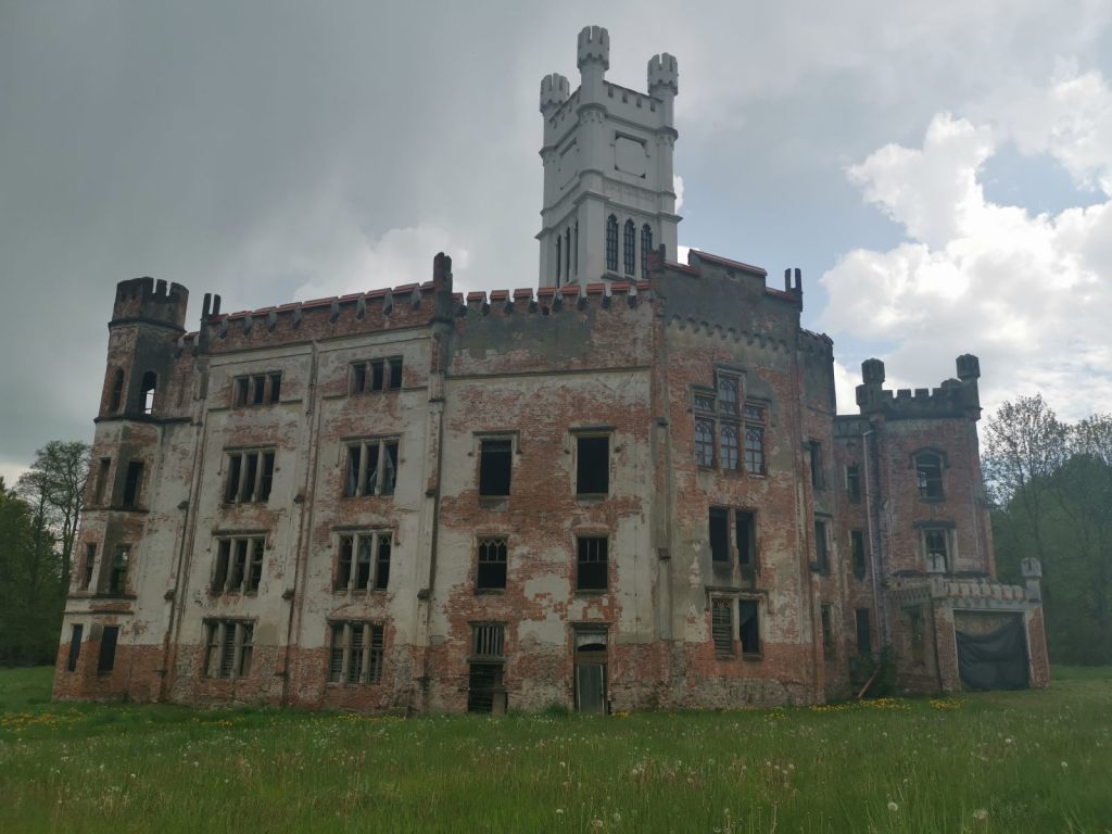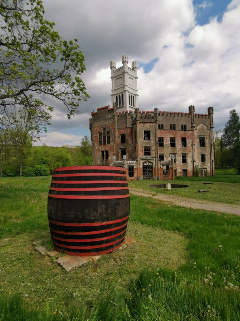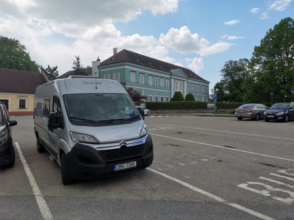 Ani tady není problém s obytným vozem zastavit, rozlehlé parkoviště je hned u rozpadajícího se zámku.