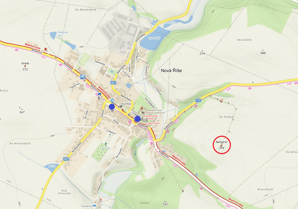 Nové Říši dominuje premonstrátský klášter a kostel sv. Petra a Pavla. Shodou okolností se zde zrovna připomínalo výročí 900 let založení, takže parkoviště před kostelem bylo obsazeno přenosovými vozy České Televize. Ale už balili. Mimo tohle ikonické parkoviště jde bez problémů zaparkovat na náměstí. Jen to parkování u kostela je prakticky rovné, to na náměstí nikoliv.