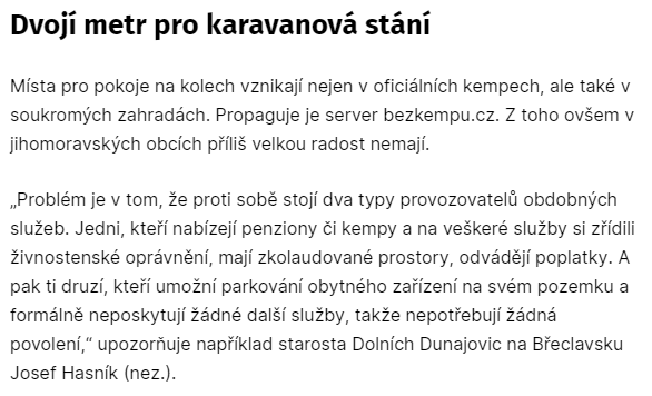 Služba bezKempu správně radí obrátit se na příslušený správní orgán. Nicméně ten je víceméně vázán současnou legislativou a pokyny a výklady dalších orgánů. Takže by měl vyžadovat pro naprostou většinu nabízených pozemků po jejich pronajímatelích živnostenské oprávnění.