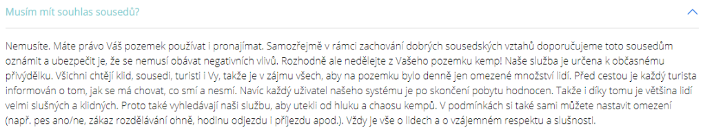 Toto vše si stačí porovnat se zněním zákonné úprav nájmu, aby bylo zřejmé, že není nabízen nájem pozemku, ale možnost tábořit. Jako perličku pak lze zmínit fakt, že z prezentace nabídky na stránkách služby plyne, že se „pronajímá“ neznámý pozemek – těžko tedy mluvit o pronájmu, pokud jedna ze smluvních stran v okamžiku „rezervace“ ani neví, o jaký pozemek se jedná.