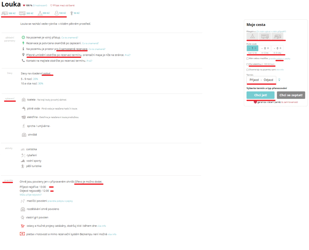 - závislost ceny na typu vybavení zájemce – karavan, přívěs, stan