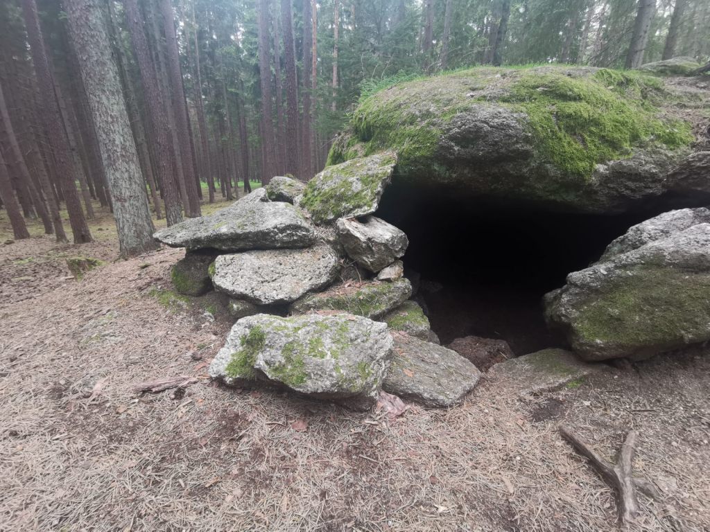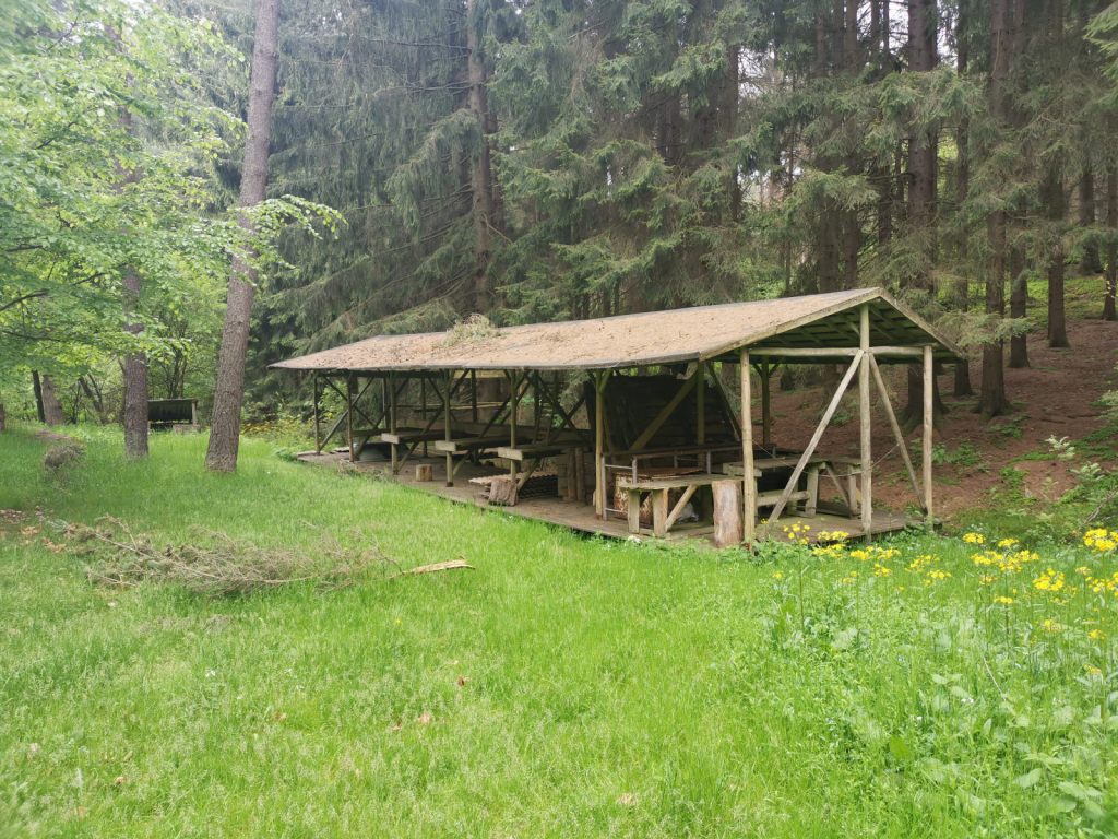 U zmíněného rybníka leží kousek vedle rybník Velký Troubný a žlutá značka vede po kraji velké přilehlé louky. Zde je další místo na tábor, teď v pozdním jaru zde hned u vody parkovali karavanisté. Nicméně žlutá stezka vede dále a po překonání další louky jde kolem skalního města. Zde je nutné odbočit a pak je to zde – zbytky tábora.