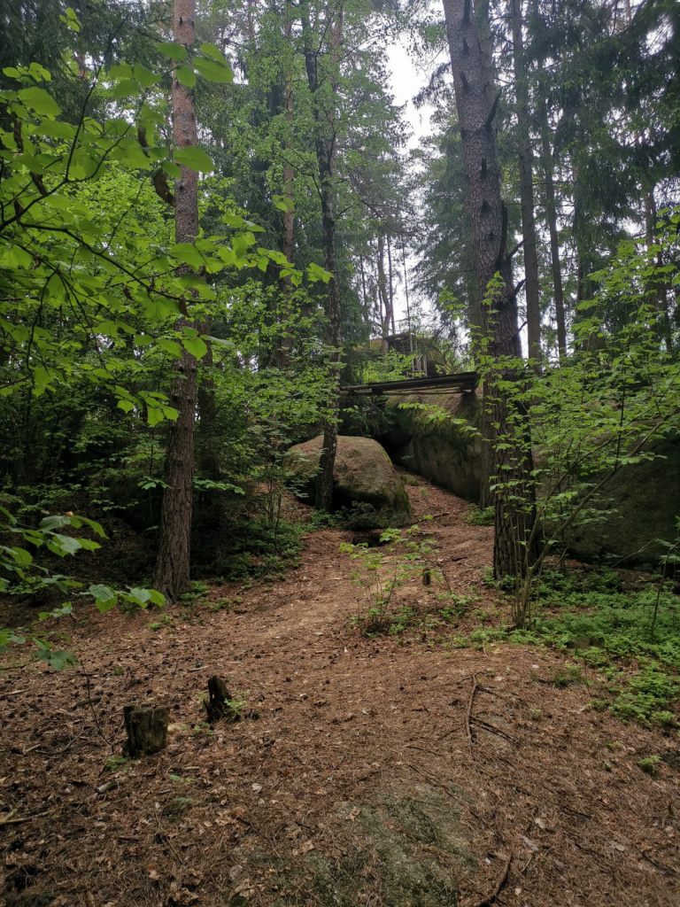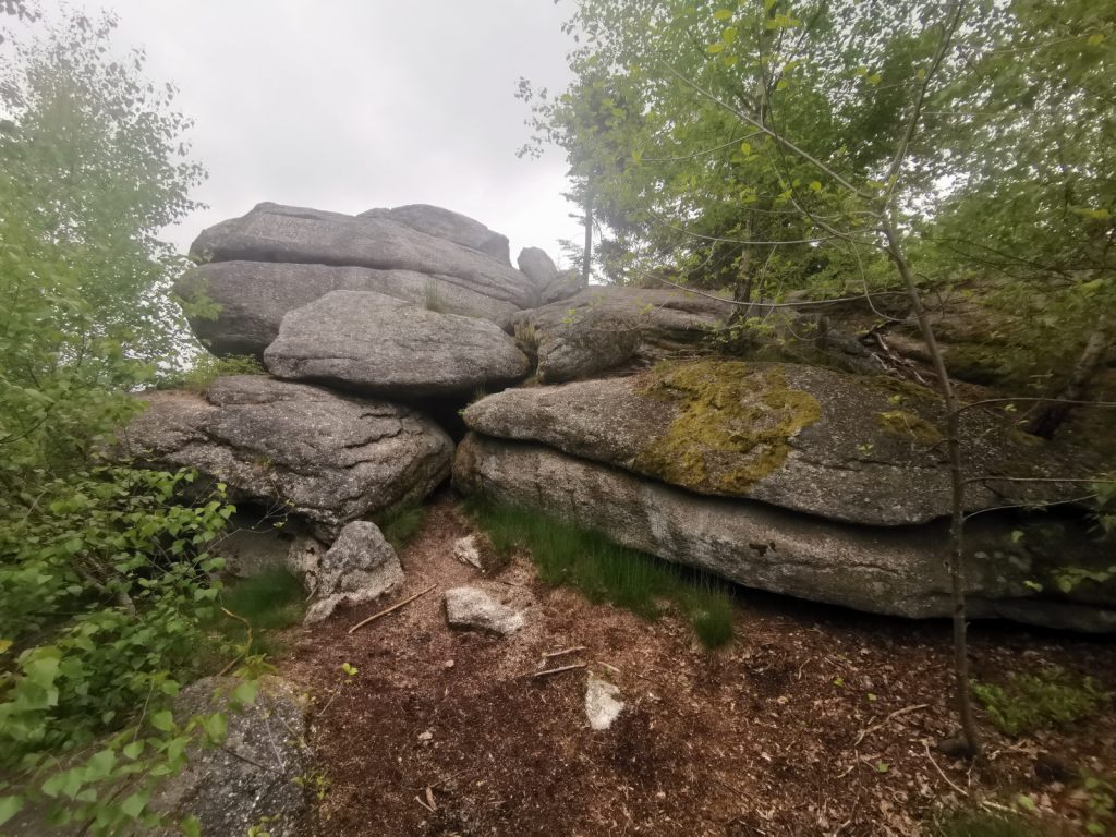 Navíc tu mají ideální a rovné místo pro stání s obytným vozem, kde snad nikoho člověk neruší. Je to vhodné výchozí místo i pro výšlap do zdejších skal a skalního města. Obojí je samozřejmě mnohem menší a komornější a nedá se to srovnávat se známými skalními městy. Něco jako Adršpach tady rozhodně nečekejte, spíš jen roztroušené skalní bloky. Ale jedno překvapení tady přeci jen je.