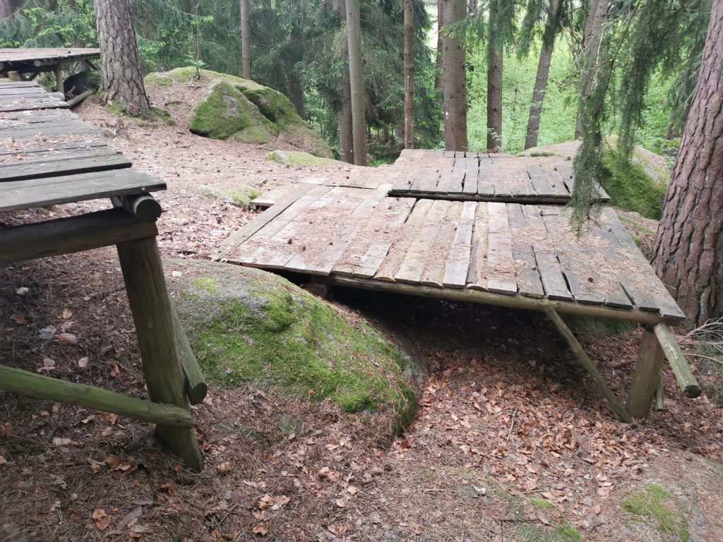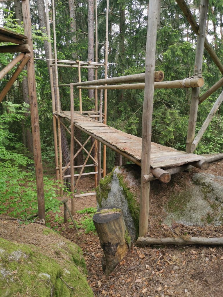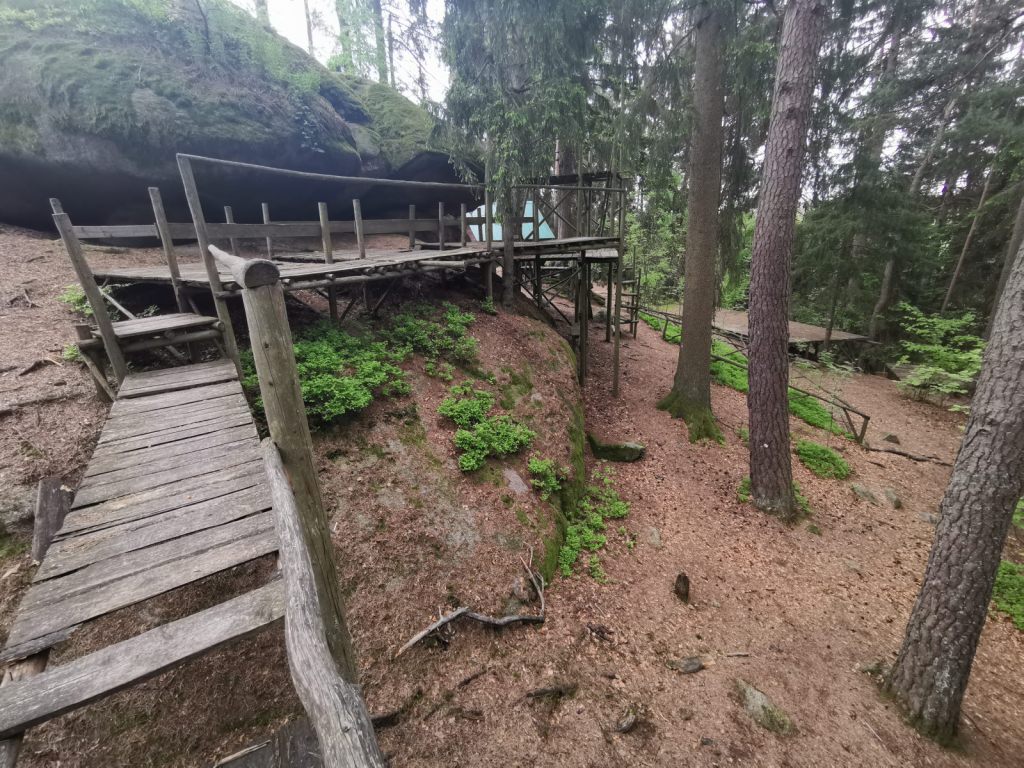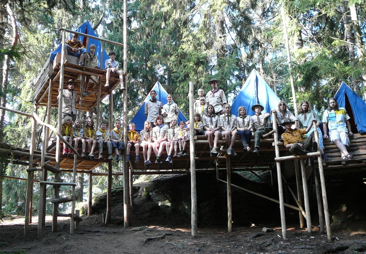 Konstrukce ještě stojí a lze po nich chodit. Zde ve skalách se od roku 1965 konaly tábory – poslední skončil snad před pár lety. Stany na kůlech, dřevěných plošínách často vysoko nad zemí, kladky po lanech – dětská vzpomínka nebyla fantazií, ale skutečností. Takový tábor byl snad sen každého kluka. A dnes, v téhle hyper bezpečné době, by se asi všem bezpečákům musely při představě podobného tábora zježit všechny vlasy na hlavě – stany ve vzduchu, dřevěné lávky….. Dokonce existují stránky s desítkami fotek, které si dovolují nostalgicky zavzpomínat. A nebo tyto stránky, které jeho existenci také připomínají.