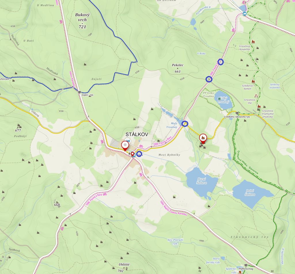 Na závěr snad ještě mapka, v modrých kroužcích jsou místa, kde se dá stát, to v obci je rovné a bez problému, v lese je to pak na kraji cest.