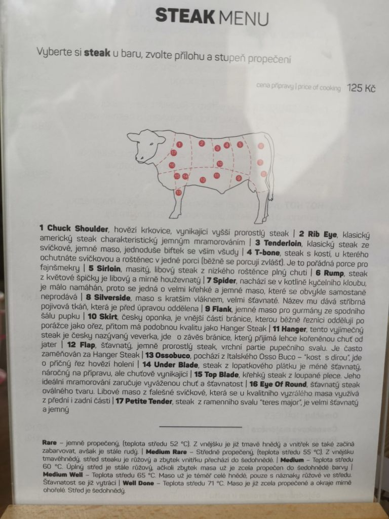 Nabízené steaky pochází ze zvířat z vlastního chovu, Aberdeen Angus. Steaky mohou být z různých částí zvířete – nebudu si zbytečně hrát na odborníka, my si dali Rib Eye a Sirloin a navíc hamburger, na výběr jsou ale další masa. Pro lepší orientaci hostů mají připravenou jak vizuální nápovědu, tak i popisy. Ty si jde už před návštěvou nastudovat na jejich stránkách.