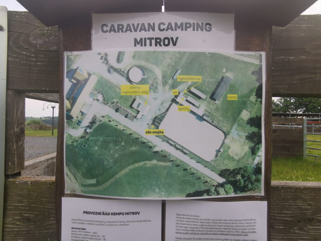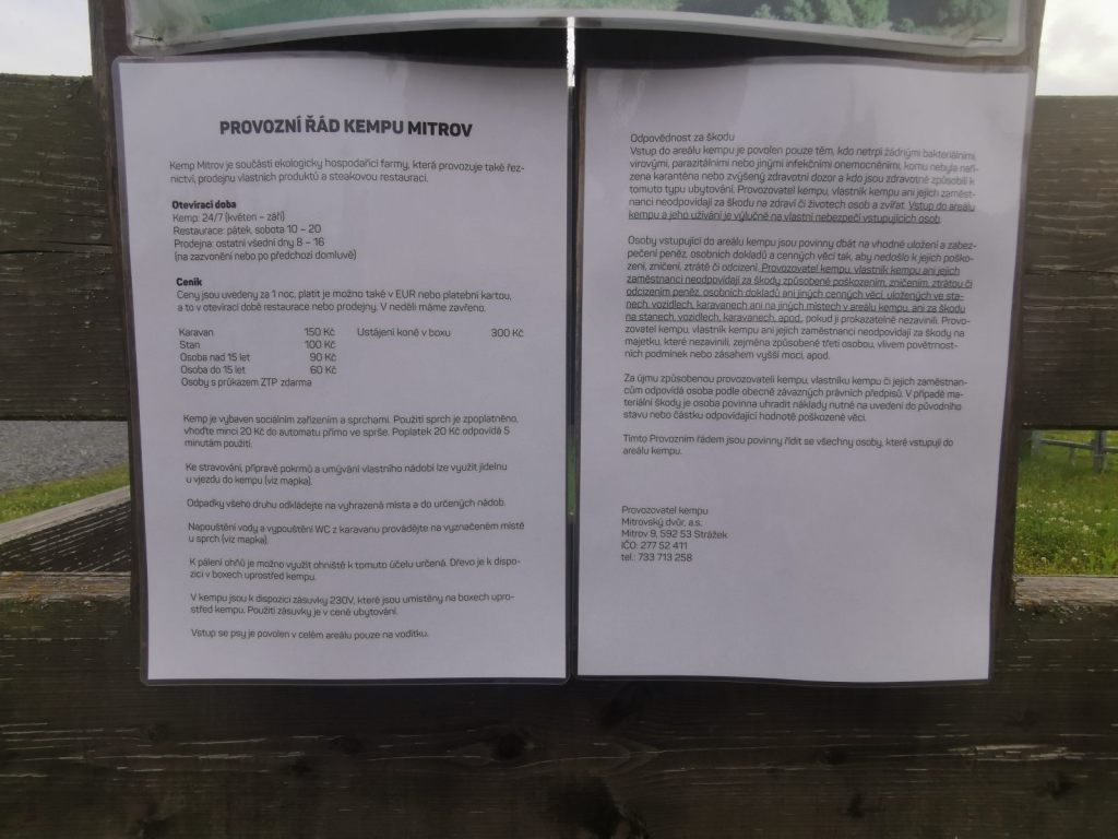 Pobyt rodiny v obytném autě, 2 dospělí a dvě děti, zde na noc vyjde na 450 Kč (bez sprch, s elektřinou). Více detailů a provozní řád lze pak najít přímo na stránkách Mitrovsky. Vzhledem k ceně jídla si myslím, že když by nabídli pro cestovatele s obytným vozem stopover zadarmo (jen přenocování), možné by přitáhli více lidí. Tržba v restauraci by to pokryla, plus nějaký dodatečný prodej i v neděli by asi taky nebyl špatným nápadem. Ale to je opět drobnost, cena není vůbec špatná a na české poměry spíše výhodná. Přitom celkově kemp působí dobře – jednoduše, funkčně, se snadnou dostupností ze silnice, nehrozí zde zapadnutí (snad jen na kempovací louce, ale v okolí je dostatek strojů na vyřešení podobné situace, pokud by nastala).