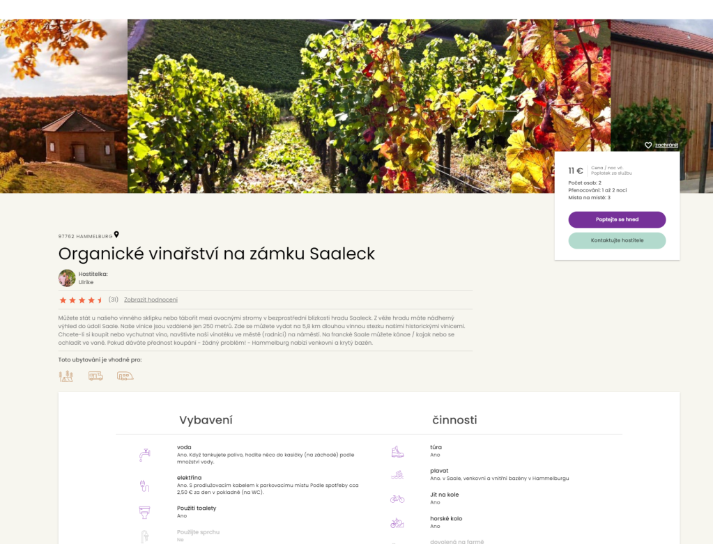 U každého místa jsou jak fotky, tak i možnost zobrazit si jeho lokaci na mapě, přehledně je pak uvedeno jeho vybavení. Samozřejmostí je i hodnocení hostů – služba funguje od minulého roku (2020), zprostředkovala již několik tisíc pobytů a tak lze na názory hostů narazit u většiny nabídek.