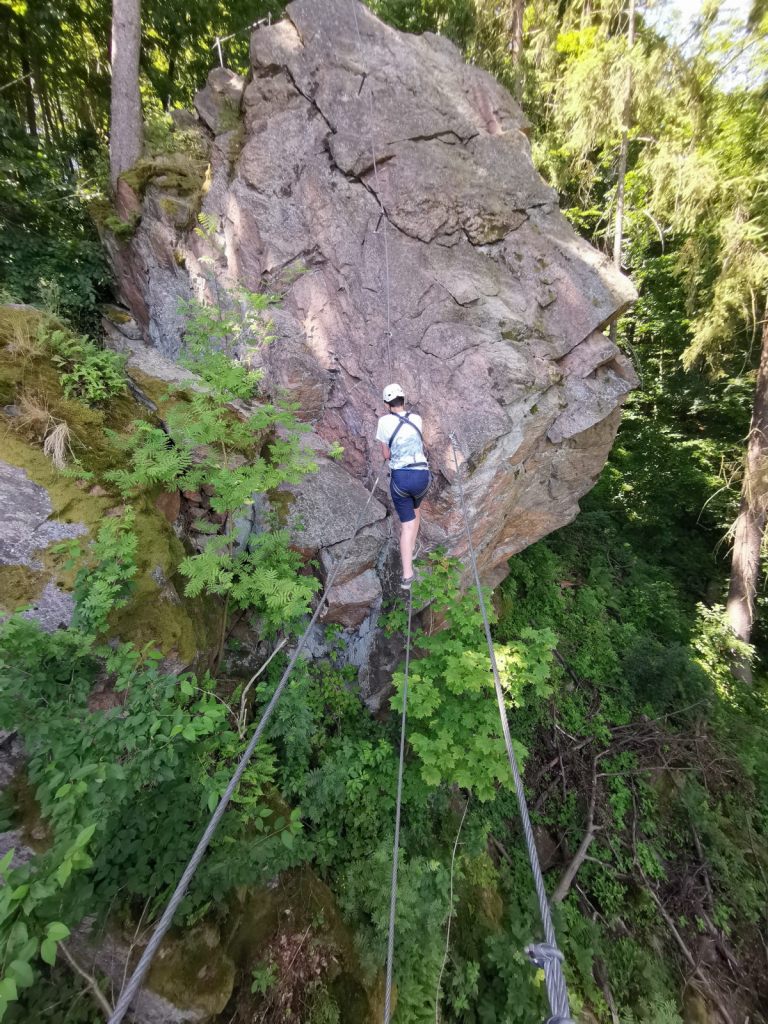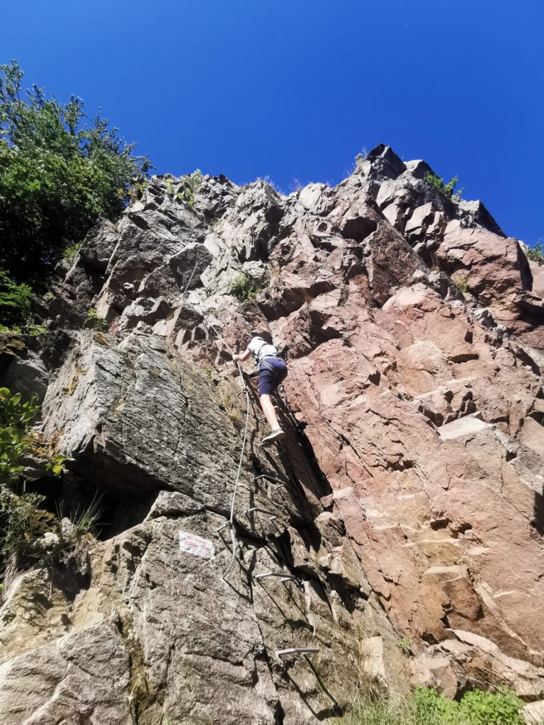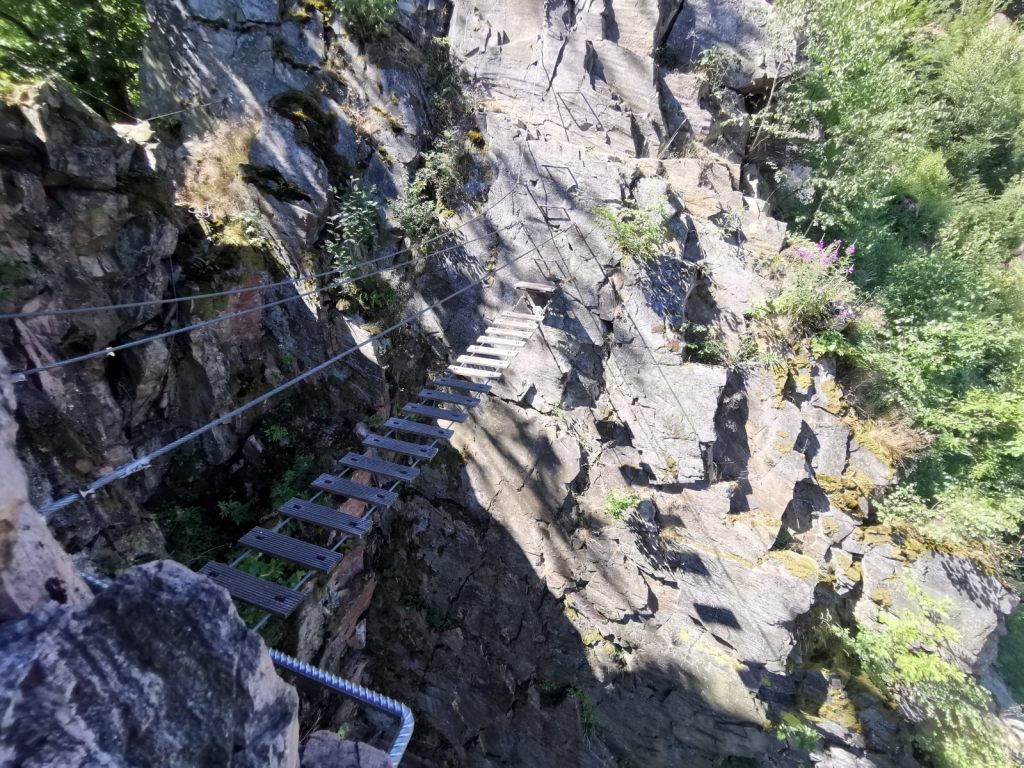 Od parkoviště pak stačí přejít most a lze nastoupit hned na první ferratu s názvem Ledová stěna. Deklarovaná obtížnost B/C se mne osobně zdá trochu nadceněná, je to příjemné béčko. Největší atrakcí je pak lávka. A ačkoliv vypadá hrozivě, zvládne se hravě.