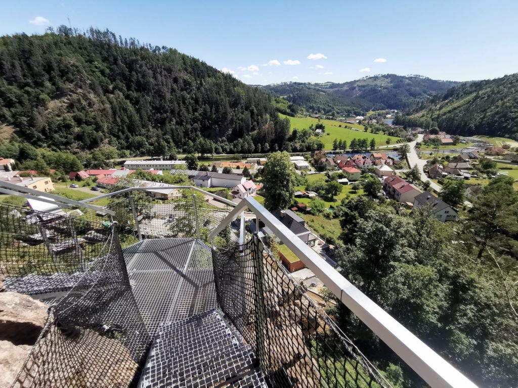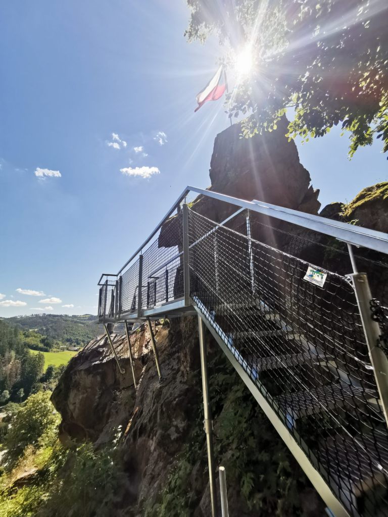 Po zdolání ferraty je dobré pokračovat nahoru a po krátkém výstupu odbočit na vyhlídku na Rossiho skálu. Vyhlídka je vlastně kovový chodník obkružující skálu s výhledem jak na údolí Svratky, tak i do údolí Bystřice. Trochu připomíná různé sky walky z Alp – ale vážně jen trochu, výšku nelze jen tak nahradit. Ale výhledy jsou pěkné.