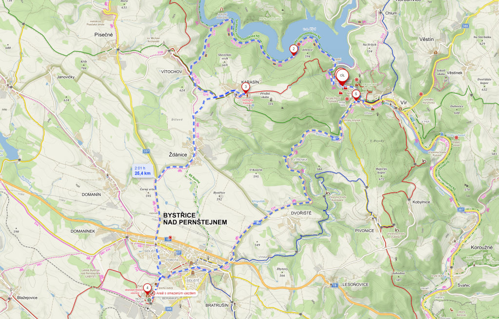 A pokud s sebou máte kole, lze se vypravit na cyklovýlet, například nahoru na hráz, pak po obvodové cestě kolem Víru, vystoupat nahoru na rozhlednu Karasín a zpět se vrátit přes údolí Bystřice. Je to příjemný, cca 20 km okruh, zvládnutelný i s přestávkou na rozhledně do dvou hodin.