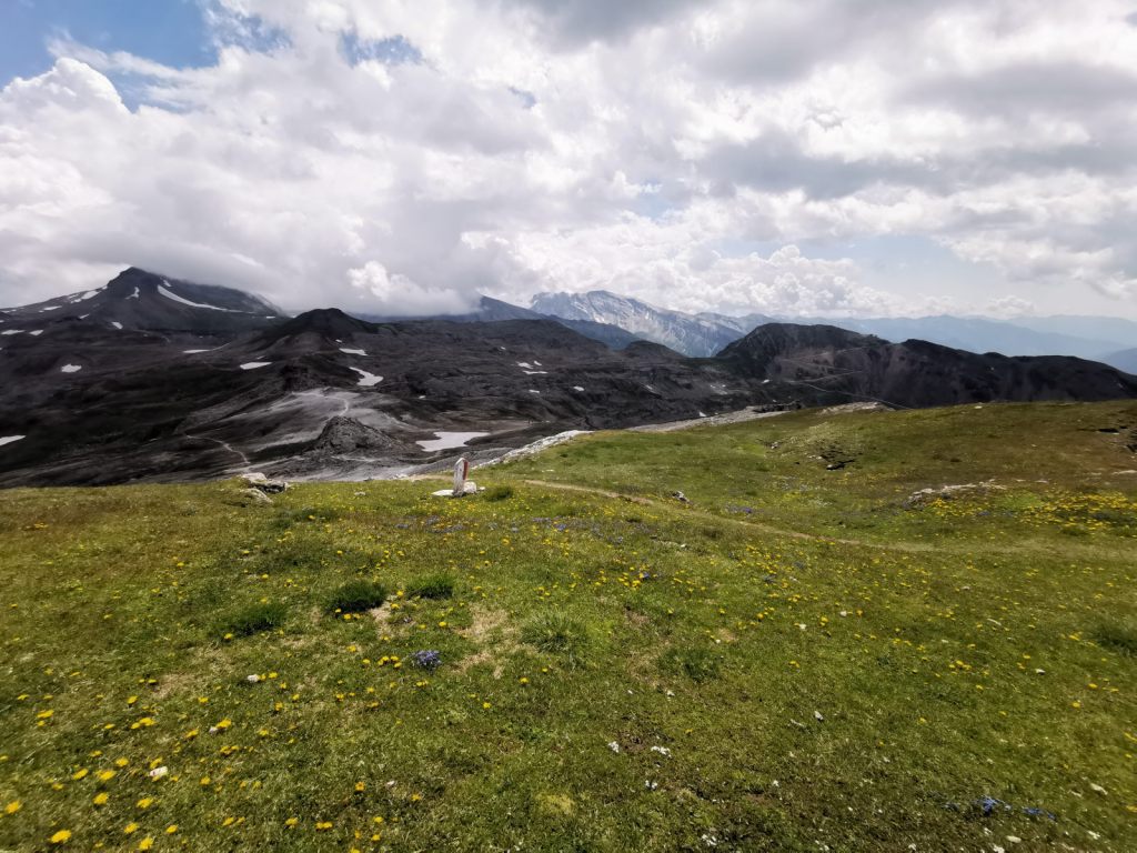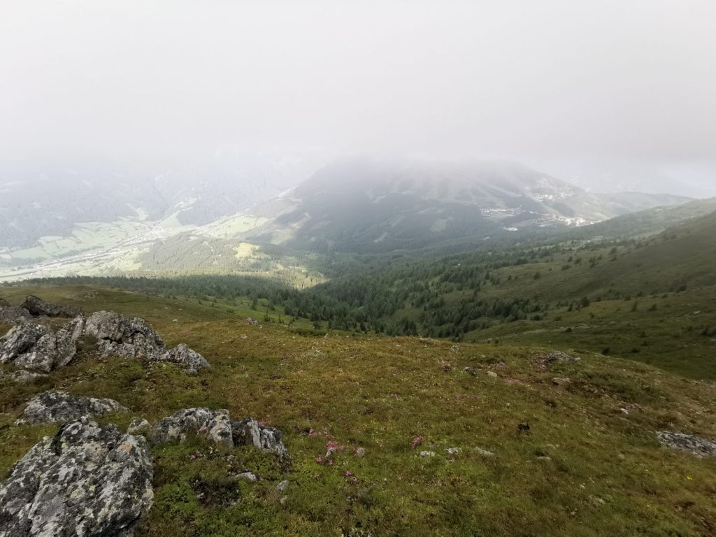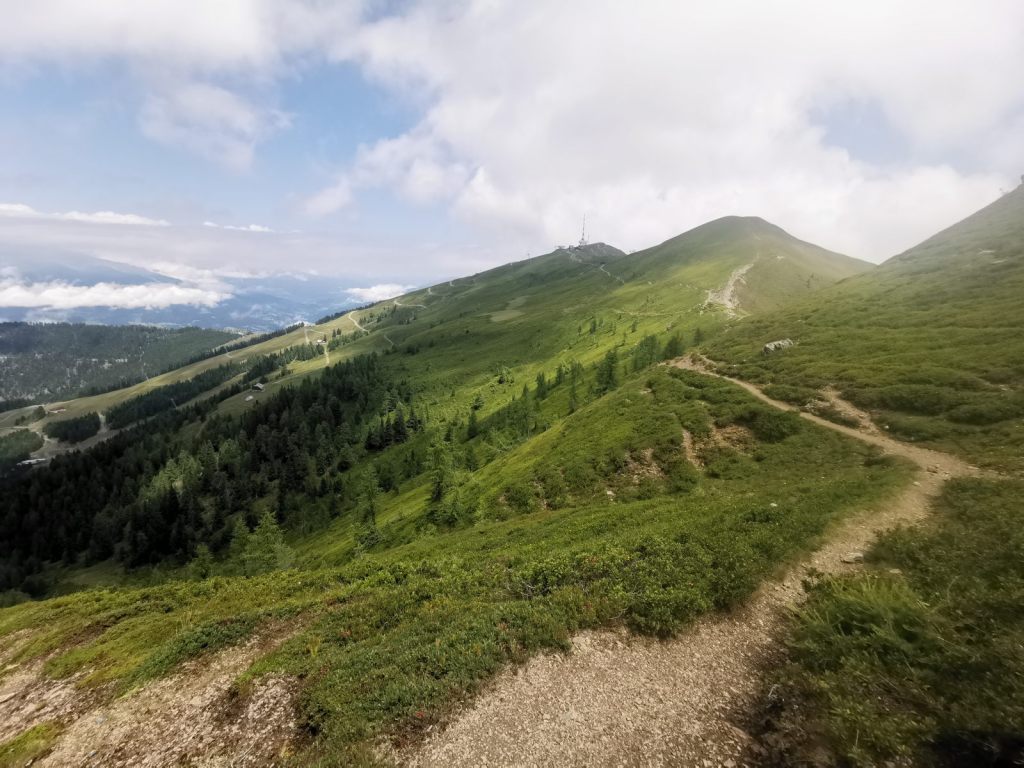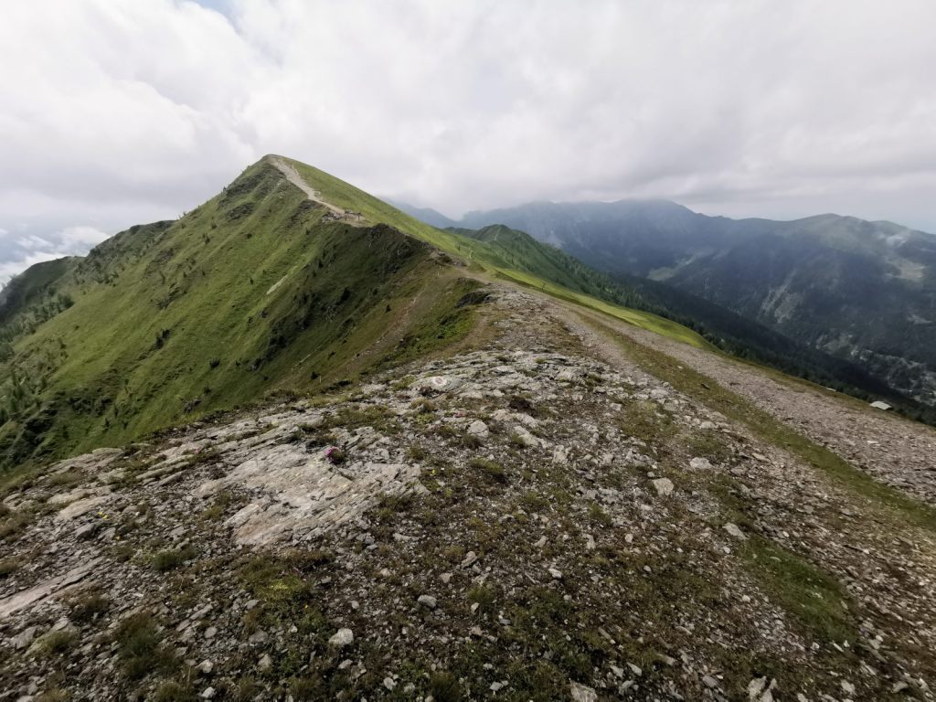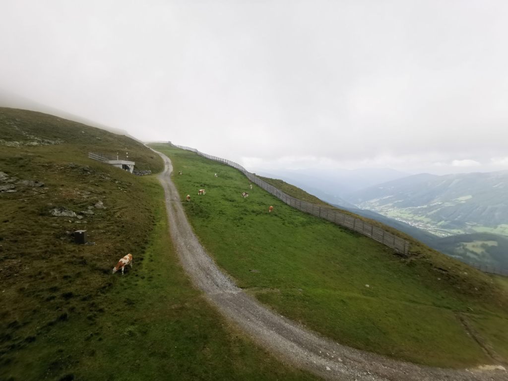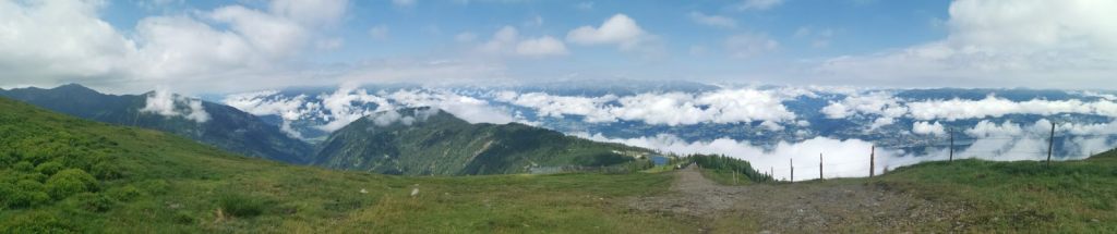 V Katschbergu lze kartu použít přímo pro průchod turniketem k nástupišti lanovky, není tedy nutné si na kase nejprve vyzvednou lístek. Nechali jsme se vyvézt nahoru, do výšky cca 2210 metrů a pak využili trasu 111 a obkroužili vrch kolem dokola, abychom nakonec sešli až dolů zpět k autu. Obešli jsme setedy bez jízdy dolů, i když i ta je v ceně karty. Zpočátku nebylo počasí nic moc a vrchol byl zahalen do mlhy. Ale ta postupně ustoupila a otevřela výhledy do kraje a do údolí.