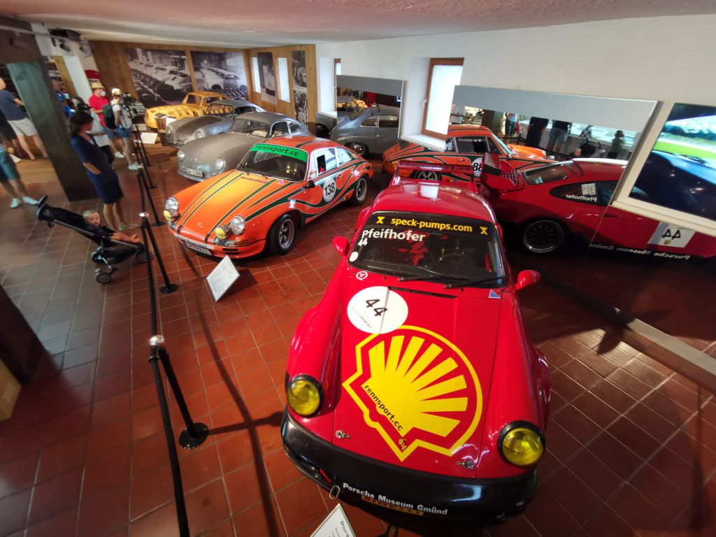 I tak se trochu zhoršilo počasí, využili jsme tedy přechod bouřkového mraku k návštěvě soukromého Porsche muzea v Gmundu. A také k nákupům – bylo potřeba doplnit zásoby pečiva a dalších potravin. Zaparkovat u muzea šlo bez problémů, ale bylo to jediné místo za celý pobyt, kde chtěli spolu s kartou vidět i naše doklady. Nicméně ihned po zjištění, že jsem z Česka kontrola skončila, viditelně potěšená obsluha nám dala českého tištěného průvodce a popřála příjemnou prohlídku.