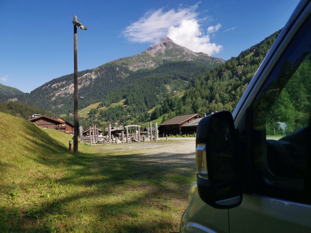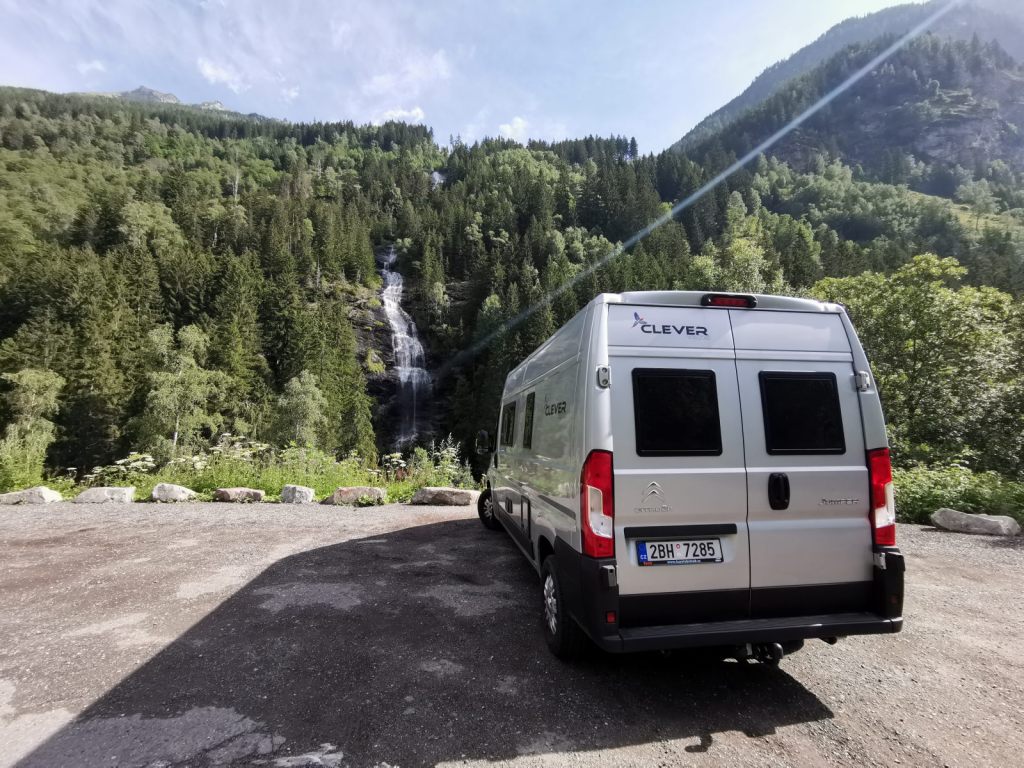 Po příjezdu byl trochu problém s parkováním, na všech parkovištích kolem lanovky a v samotném městečku byl zákaz stání obytek přes noc. Nechtěl jsem jej zbytečně porušovat – i když by se asi nic nestalo, zejména na parkovišti vedle hřiště dole v obci. Sjeli jsme kus zpět a přespali na plácku vedle boční silnice. Ráno jsme se přemístili před vodopád a v poklidu se nasnídali ( i na tomto parkovišti je ale noční zákaz). A poté jsem se vrátili zpět to Heiligenblutu, sjeli opět dolů a nechali auto na již zmíněném dětském hřišti. Parkování zde je zdarma, stejně jako zhruba do poloviny kopce vedoucího k lanovce. Další parkoviště v obci blíže konečné stanici jsou pak již vesměs placená a prostorově omezená. Je zde ale i parkovací dům s místem pro obytné vozy, cena je tuším €8 – soudě dle hromady vozů v neplacené části a prázdným placeným parkovištím, nebyli jsme jediní, kdo na parkovném ušetřil.