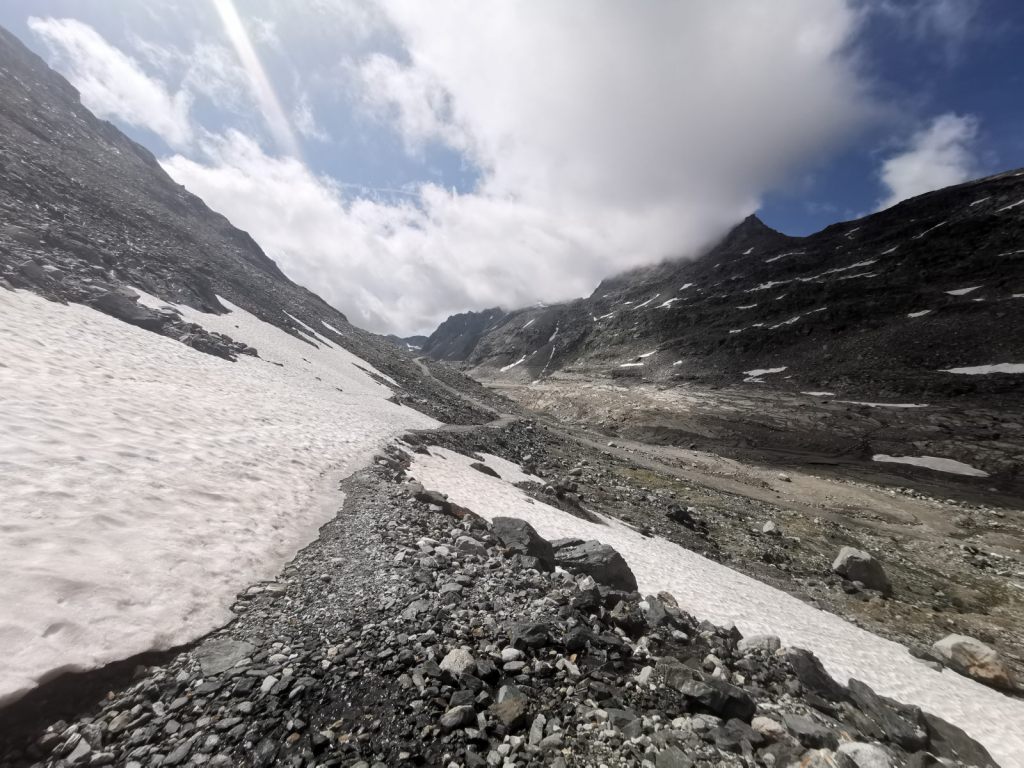Cesta nahoru opět bezproblémová, opět jsme dostali zálohované lístky. Jízda expressem, podzemní lanovkou je zážitkem. Z ní se přestupuje na kabinkovou dráhu nahoru. Cesta sedačkou až na vrchol v 3200 metrech pak v ceně není, ale lze si za ni připlatit. Což jsme neudělali, tentokrát jsem jízdu přerušili v prostřední stanici a vydali se nahoru pěšky. Oklikou přes zadní sjezdovky. Zejména poslední úsek je trochu náročnější, stoupá se černou sjezdovkou. Oproti Ankogelu je tady převážně kamenitý terén s minimem vegetace – skutečné kamenné království, zejména v zadní části. U mezistanice je přeci jen o poznání zeleněji. Pro vetší pohodu lze zvolit nahoru jinou cestu, která není tak strmá – ale my si dali do těla výstupem po sjezdovce. Nahoře pak upoutá pohled na lyžaře na ledovci. Ale nevím, moc by mne to na lyžování nelákalo – kolem ledovce jsou zástupy lidí, někde zkouší bobovat či sáňkovat, povrch také nic moc.