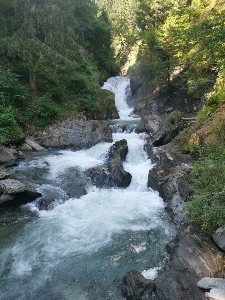 Po návratu do údolí zbylo ještě dost času na návštěvu dvou soutěsek, Raggaschlucht a Groppensteinschlucht,které jsou v hlavním údolí nedaleko od sebe. Přes svoji blízkost nabízí každá z nich jiný zážitek. Raggaschlucht je akčnější, proud vody se valí hlubokým zářezem a atmosféra je zde skutečně dramatická. Bohatá vodní tříšť na mnoha místech i stín soutěsky jsou v horkém letním dnu vítané. Pohled na obroušené skalní stěny dává tušit, že někdy je zde voda nepříjemně vysoko. Tahle soutěska se nám líbila více než ta druhá.