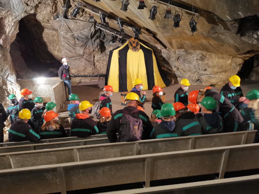 A pak už jen obléci ochranné obleky, nasadit přilbu a vydat se zhruba na dvou hodinovou exkurzi do dolů. Zahajuje ji cesta skluzavkou dolů. Pak několik expozic, vesměs směsice světelných a zvukových efektů a filmu – poutavé, i když neumím německy. Jízda vláčkem a nakonec jízda výtahem nahoru. Část dolu se používá i pro dozrávání místních sýrů. Ubíhá to rychle a je pořád na co koukat, těch zhruba 100 minut uběhne rychle. A nahoře šok – jednak se změnilo počasí a pršelo a pršelo. A jednak těch lidí – fronta na vstup se táhla ven z budovy až do poloviny parkoviště. Parkovací plochy obsypané auty, včetně příjezdových cest. Byli jsme rádi, že jsme zde byli tak brzy. Možná byl takový zájem díky deštivému počasí či díky tomu, že byla neděle – kdo ví….