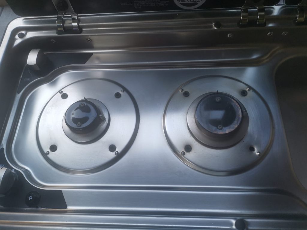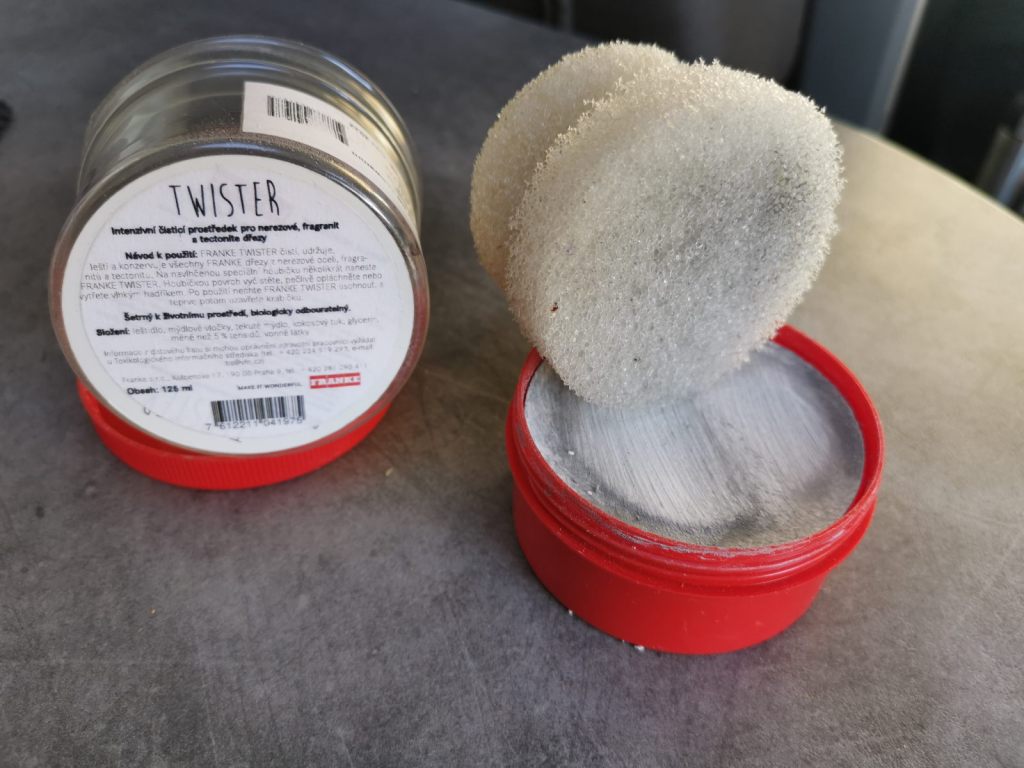 Jsem trochu nešikovný kuchař a tak se mi nerezová plocha pod vařičem ne vždy daří udržet čistá. Po delším pobytu ji je nutno trochu důkladněji vyčistit. Osvědčila se mi houbička s krémem značky Franke Twister. Nejprve se musí odstranit plotýnky, pak se plocha nejprve očistí vodou od běžných nečistot a poté se doleští pomocí houbičky „namočené“ do pasty.