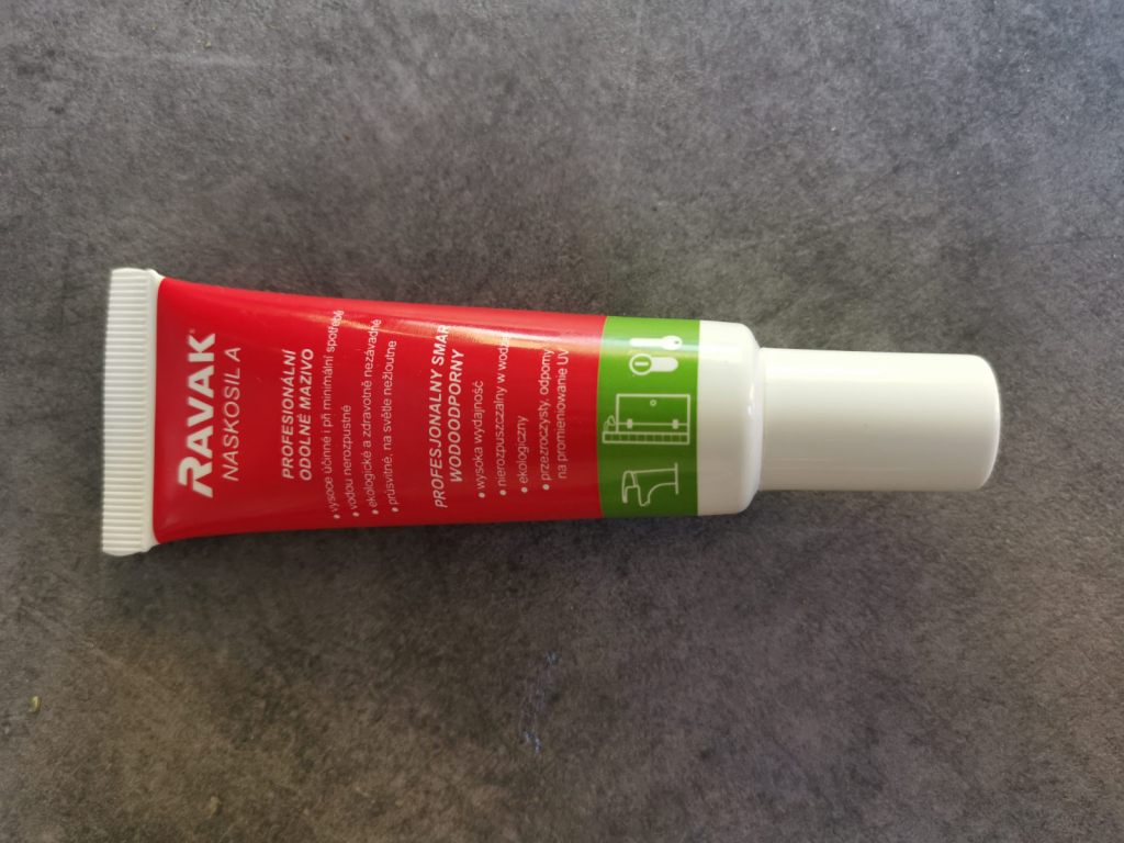 Používám Ravak mazivo. Běžně je k dostání v hobby marketech typu Hornbach, Bauhaus či koupelnových studiích, cena kolem 130-190 Kč a vydrží mnoho a mnoho použití. Stačí jej trochu nanést do drážek, přejet dveřmi, aby se rozneslo, případné větší zbytky setřít. Výsledkem je hladší a méně hlasitý pohyb roletových dveří při otevírání a zavírání koupelny.